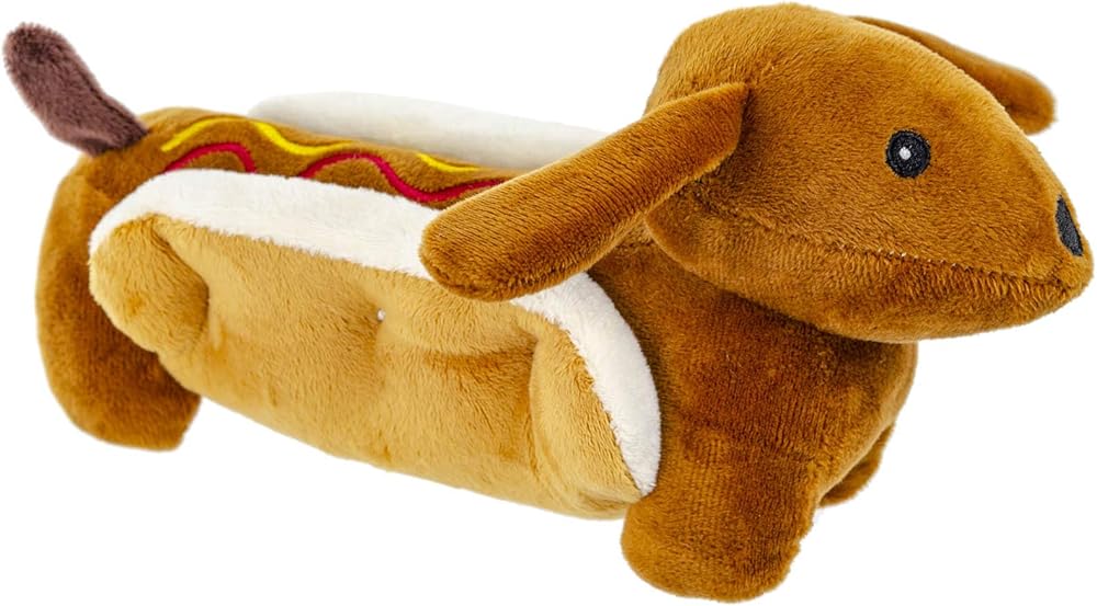 وقت الشواء! أوه، فقط أمزح. هذا كلب متنكر في زي هوت دوج. حتى أنه يضع بعض الكاتشب والخردل على نفسه لإكمال المظهر. ولكن لا يمكن أن تخفي حقيقة وجود صرير من الداخل ولا حقيقة أنها مصممة بشكل مثالي لتكون أفضل صديق جديد للكلب.