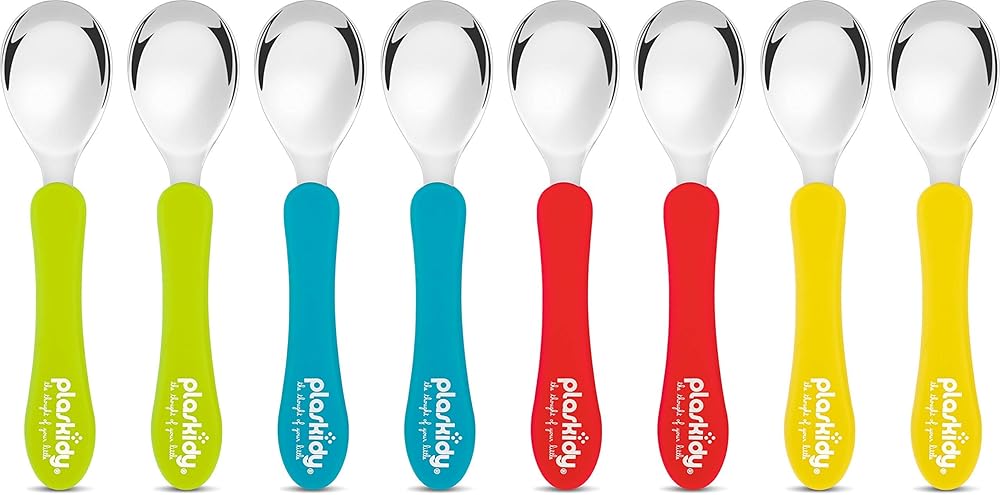 Plaskidy Toddler Spoons Stainless Steel with Silicone Handle Set of 8 Kids Spoons Cutlery Set - Children Safe Utensil Set BPA Free Dishwasher Safe Kid Spoons Flatware Great for Kids and Toddler Spoon