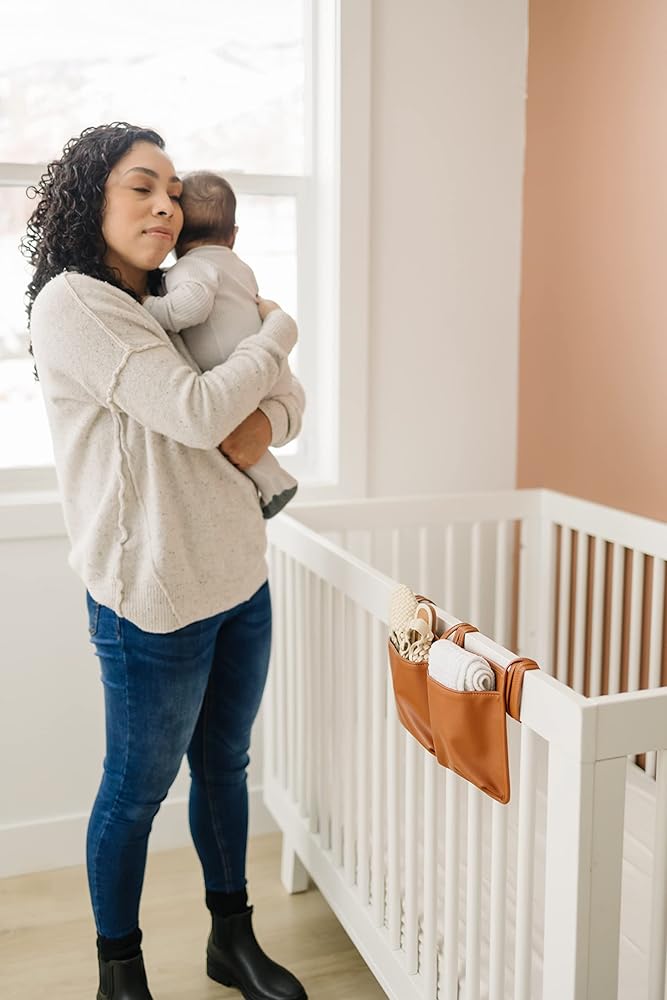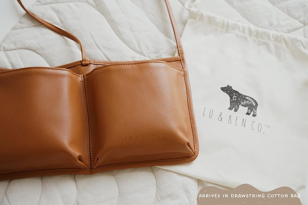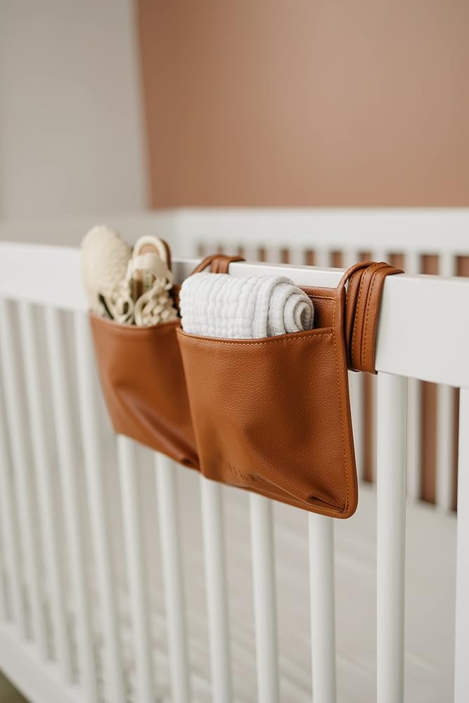 The Lu & Ken Co. hanging storage organizer perfectly combines functionality with style, creating a practical tool for parents by providing instant easy access to your little one's essentials! Safely store anything from bottles, toys, clean diapers or clothes within immediate reach, saving your time and energy! Made with highest quality vegan leather and a classy color that matches any nursery style, this bedside pocket would make a wonderful baby shower gift idea for soon to be moms.