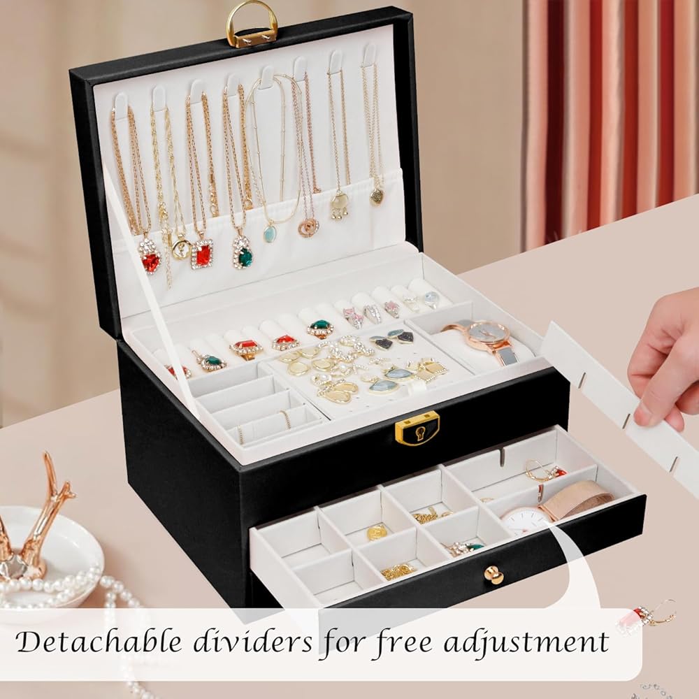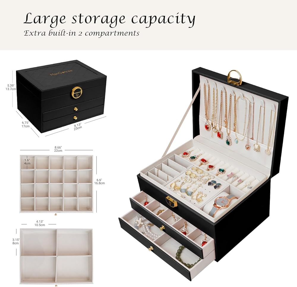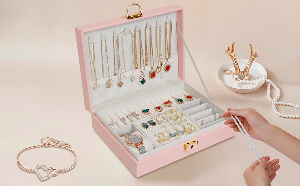 [هدية مثالية رائعة]: تأتي حقيبة تخزين المجوهرات بثلاثة ألوان من الوردي/الأبيض/الأسود، أنيقة وواسعة. يضيف قفل الأمان مع المفتاح الأناقة والأمان، هدية مثالية لأعياد الميلاد أو الكريسماس أو عيد الحب أو عيد الشكر أو يوم تذكاري خاص.