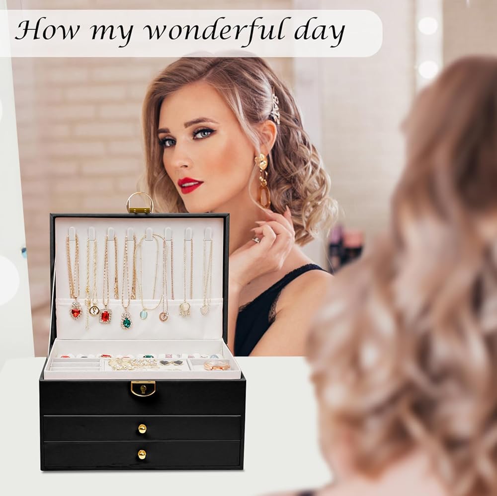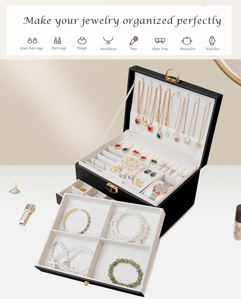 [جلد بولي يوريثان عالي الجودة]: صندوق المجوهرات مصنوع من جلد البولي يوريثان عالي الجودة، ومقاوم للماء والغبار وسهل التنظيف، مما يوفر حماية شاملة من الخدوش أو التلف لجميع مجوهراتك العزيزة.