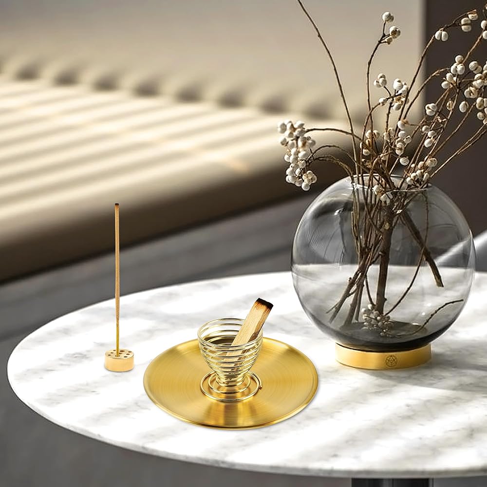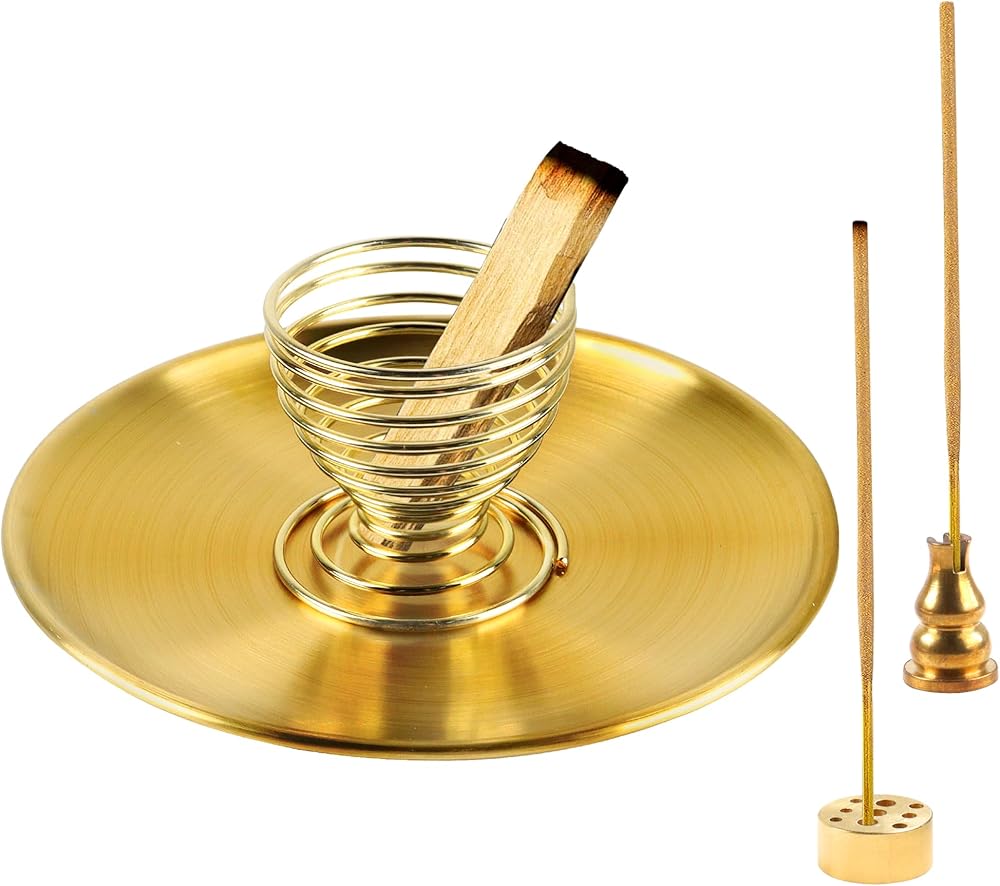 مبخرة 4 في 1، حامل بالو سانتو، حامل مريمية، حامل بخور نحاسي 5.5 انش لعصي البخور/لفائف البخور/مخاريط البخور، مجموعة مبخرة بيضاوية ذهبية لالتقاط الرماد لغرفة التامل واليوغا