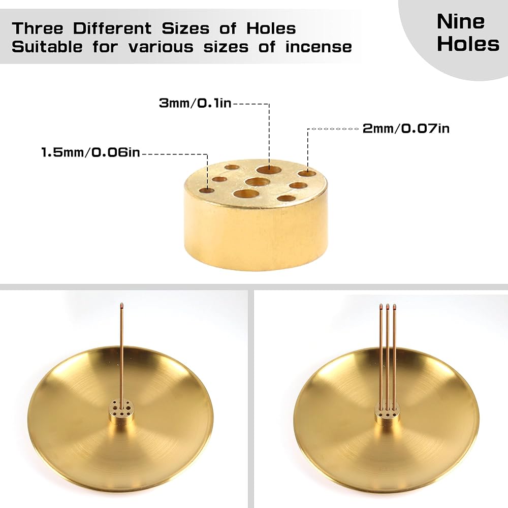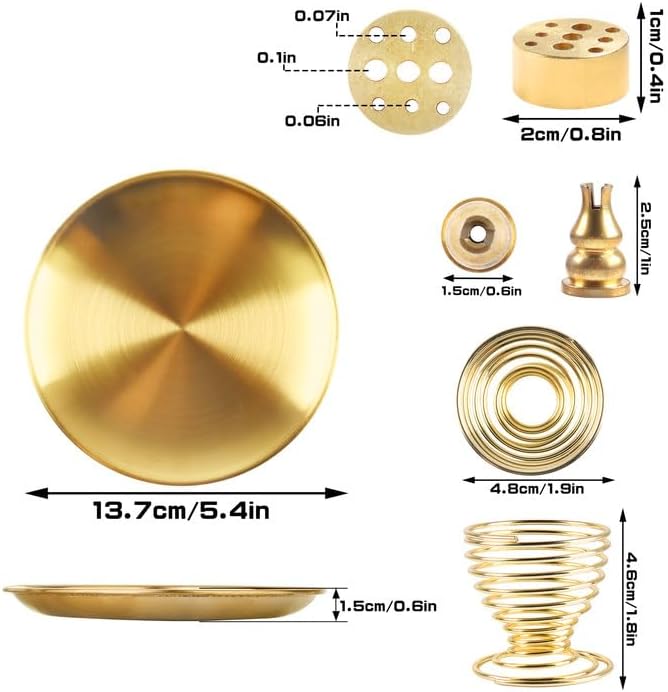 تتضمن العبوة 1 صينية معدنية بقطر 5.5 انش؛ 1 حامل بخور نحاسي على شكل قرع، الحد الأقصى لقطر البخور الذي يمكن إدخاله هو 0.12 انش؛ 1 حامل على شكل قرص 9 فتحات مع ثلاثة فتحات (0.06 انش/0.08 انش/0.12 انش)؛ 1 حامل بالو سانتو أو المريمية بقطر 4.8 سم. سنسنسم