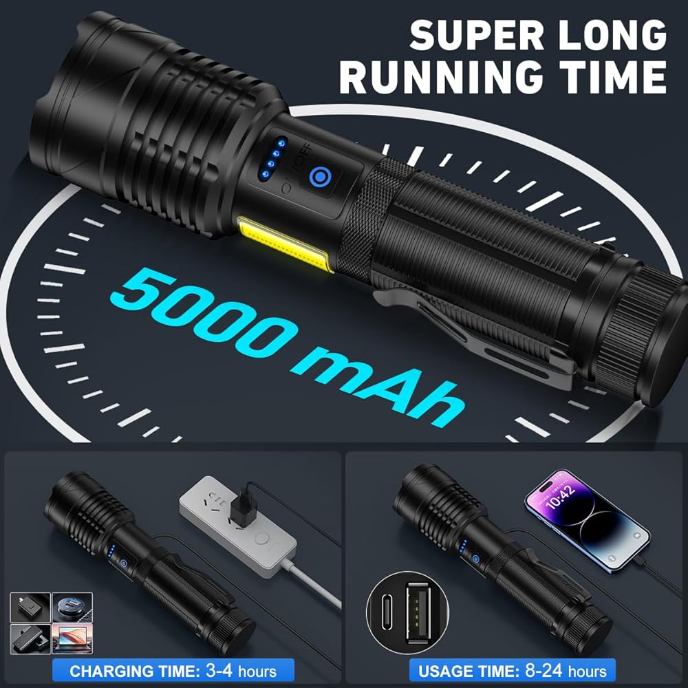 • [سعة كبيرة 5000 مللي أمبير في الساعة ومنافذ الإدخال والإخراج]--مصباح يدوي قابل لإعادة الشحن يشتمل على بطارية ممتازة قابلة لإعادة الشحن بقدرة 5000 مللي أمبير في الساعة، قادرة على العمل بشكل مستمر لمدة 8-24 ساعة. هذه المصابيح الكاشفة القوية ذات اللومن العالي القابلة لإعادة الشحن لها وظيفة إخراج، عندما تكون بدون طاقة ويمكن عكسها شحن هاتفك. يمكن لمصباح LED القابل لإعادة الشحن أن يحل احتياجاتك العاجلة. بالإضافة إلى ذلك، نظرًا لأن هذا المصباح اليدوي الساطع لديه وظيفة معينة لتبديد الحرارة، فإن العمر الافتراضي يمكن أن يصل إلى 200000 ساعة.