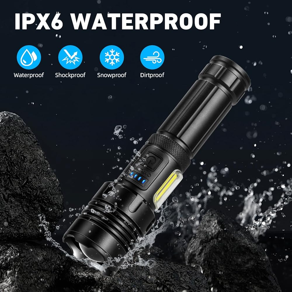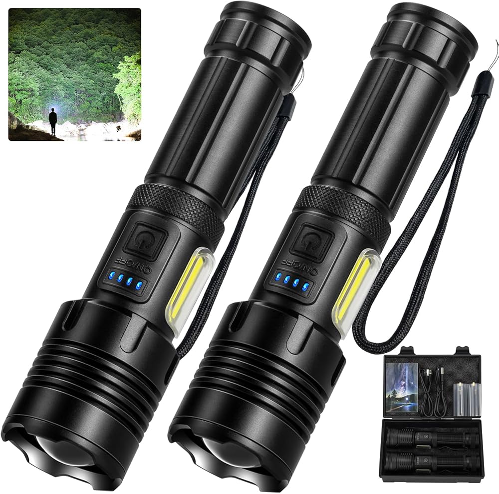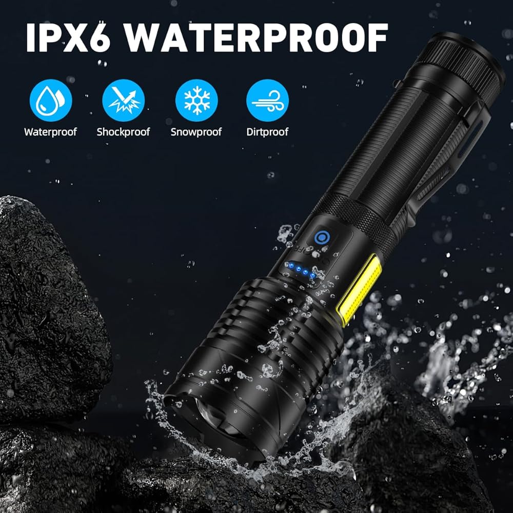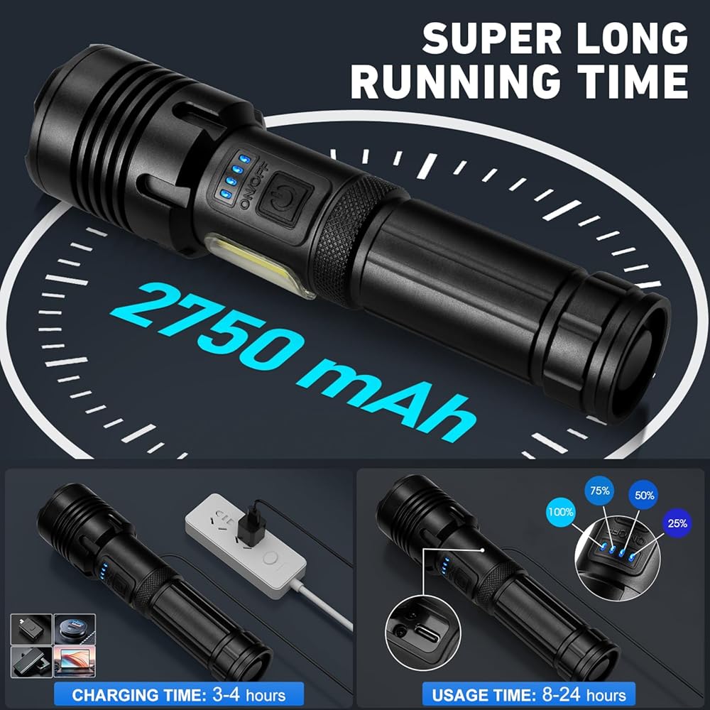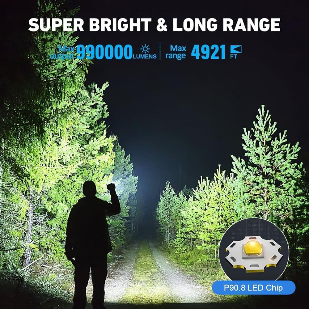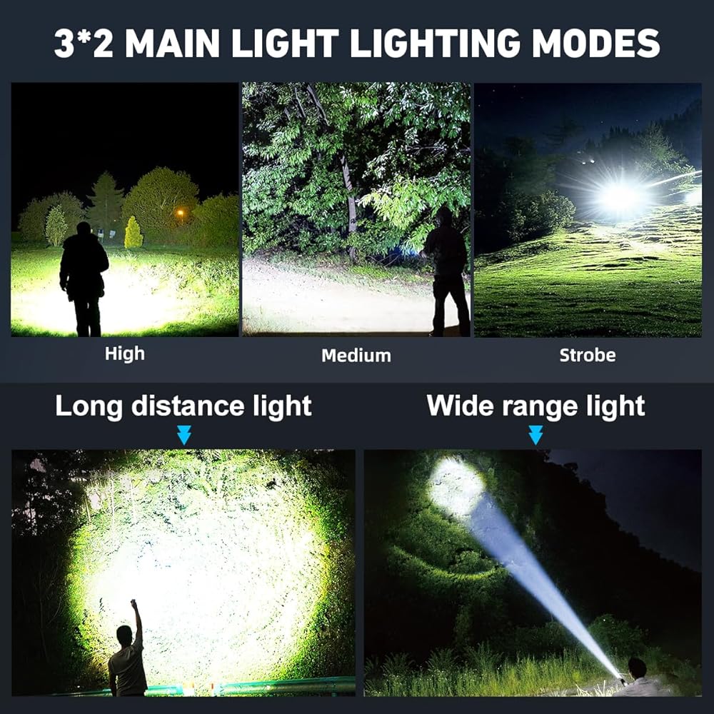 • [900000 مصباح يدوي عالي الإضاءة]--عبوة من مصباح يدوي LED قوي قابل لإعادة الشحن مع رقاقة XHP90.8 LED مطورة، أكثر سطوعًا 30 مرة من المصابيح الكاشفة الأخرى. سطوع عالي 900,000 لومن والحد الأقصى لمسافة التشعيع يمكن أن تصل إلى 4921 قدمًا. المصابيح الكاشفة ذات اللومن العالي القابلة لإعادة الشحن تضيء الرؤية بأكملها بسهولة في بيئة مظلمة للغاية، مما يبقيك بعيدًا عن الظلام.