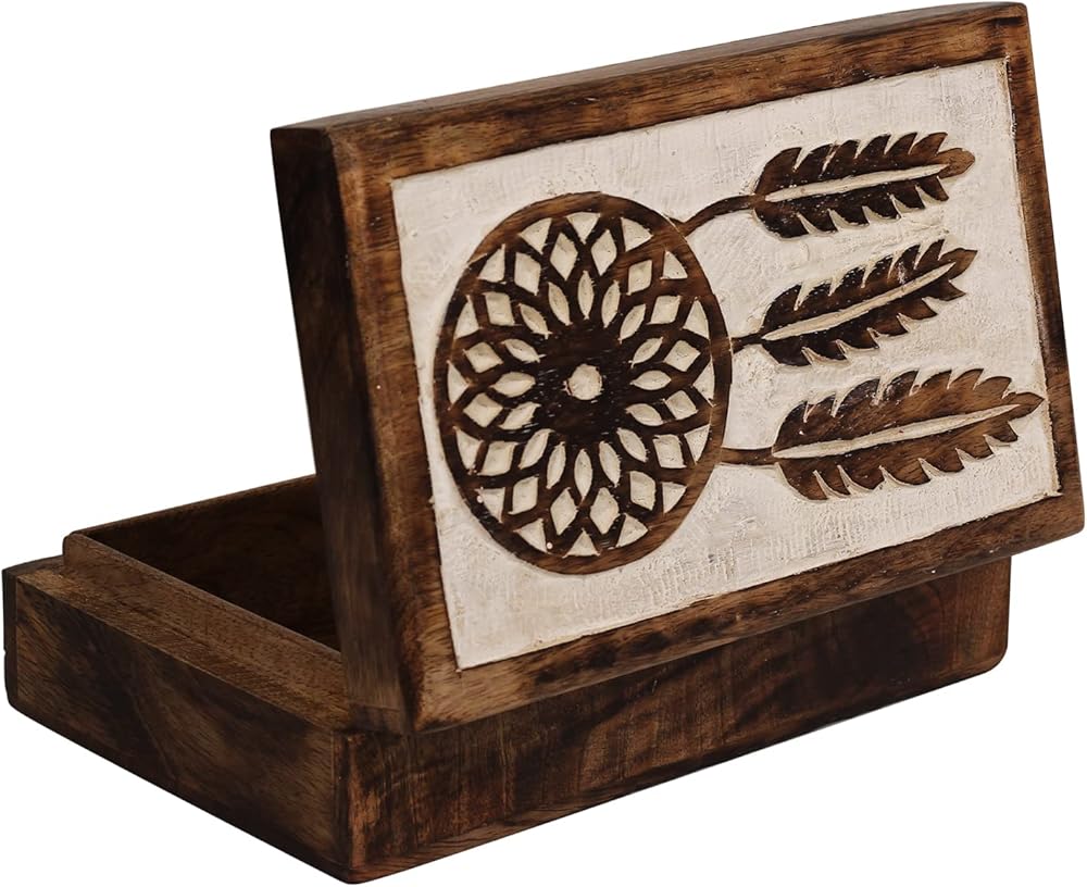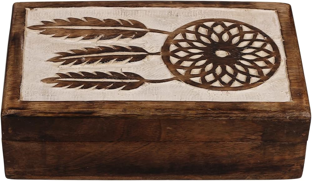 التصميم: يتميز هذا الصندوق المصنوع من خشب المانجو الصلب باحتوائه على صائد الأحلام العميقة المنحوتة بشكل معقد أعلى الصندوق. صنع النحت يدويًا بواسطة حرفيين مهمسين في القرى الهندية.