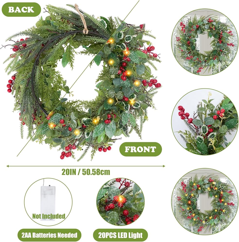 زينة عيد الميلاد - إكليل عيد الميلاد هذا مزود بـ 20 مصباح LED. إكليل عيد الميلاد بما في ذلك مجموعات التوت الأحمر وأغصان الصنوبر وبعض أوراق الشجر المزيفة والثلج الأبيض لإضفاء تأثير لوني كلاسيكي على عيد الميلاد