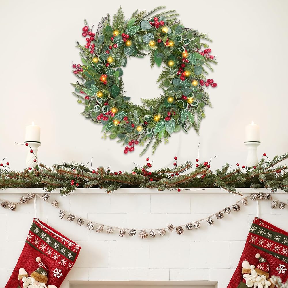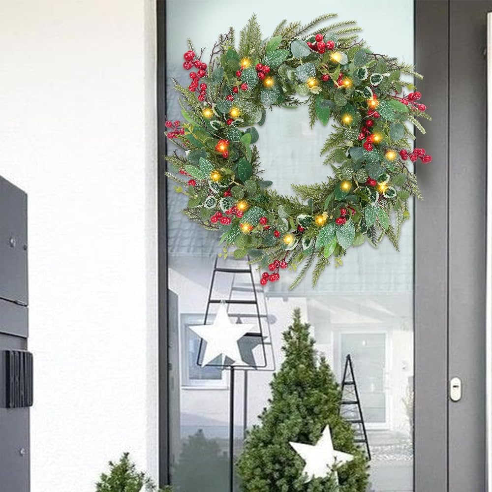 إكليل عيد الميلاد المضاء مسبقًا - إكليل باب عيد الميلاد يعمل بالبطارية (تحتاج إلى بطاريات 2AA، ليست في العبوة)، إكليل عيد الميلاد الاصطناعي المثالي لتزيين عيد الميلاد في الأماكن المغلقة أو الهواء الطلق، أو النافذة أو المدخل لإضافة شعور احتفالي إلى أي منطقة في المنزل.