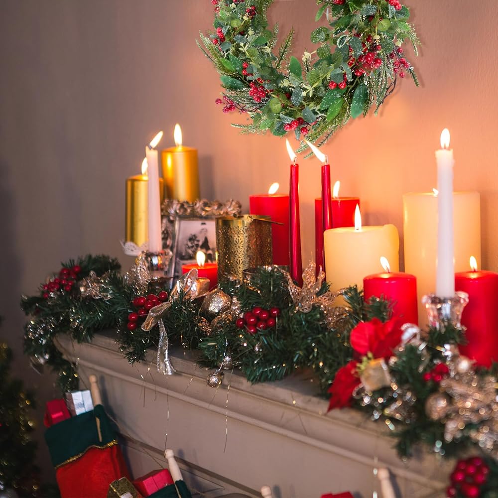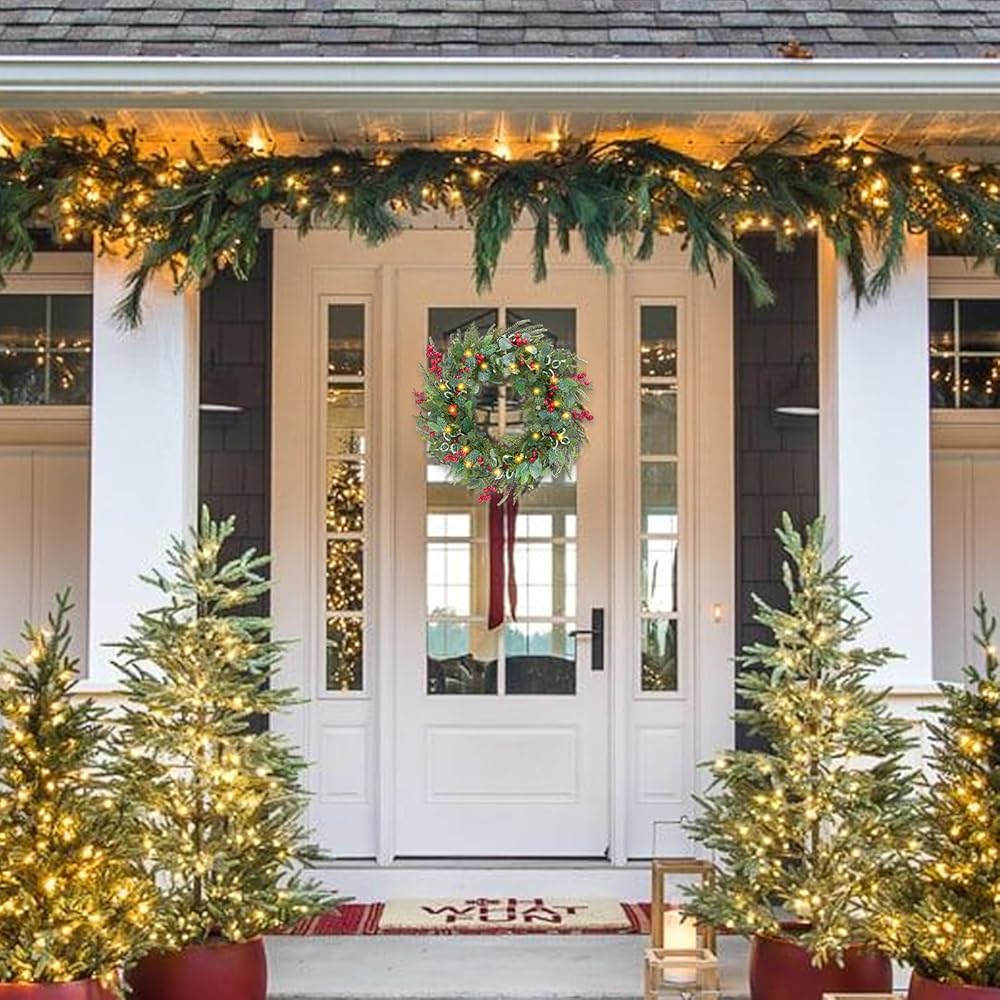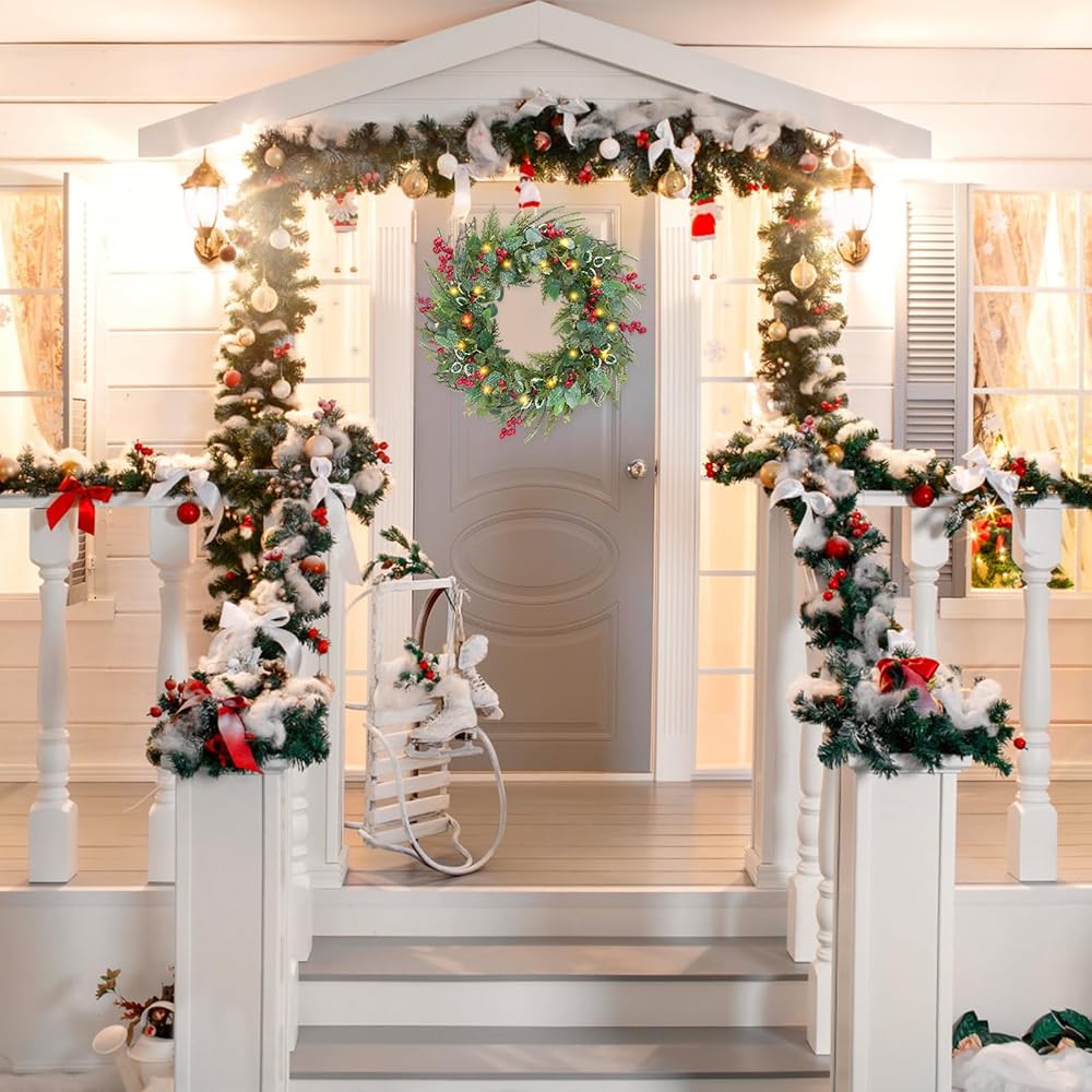 المزيد من ديكورات عيد الميلاد - قم بتعليق إكليل الباب على الباب الأمامي، وغرفة المعيشة، والمدفأة، والخزائن، والجدران، والأرفف، وما إلى ذلك. نقترح وضع إكليل عيد الميلاد على الشرفة المغطاة لأن علبة البطارية ليست مقاومة للماء.