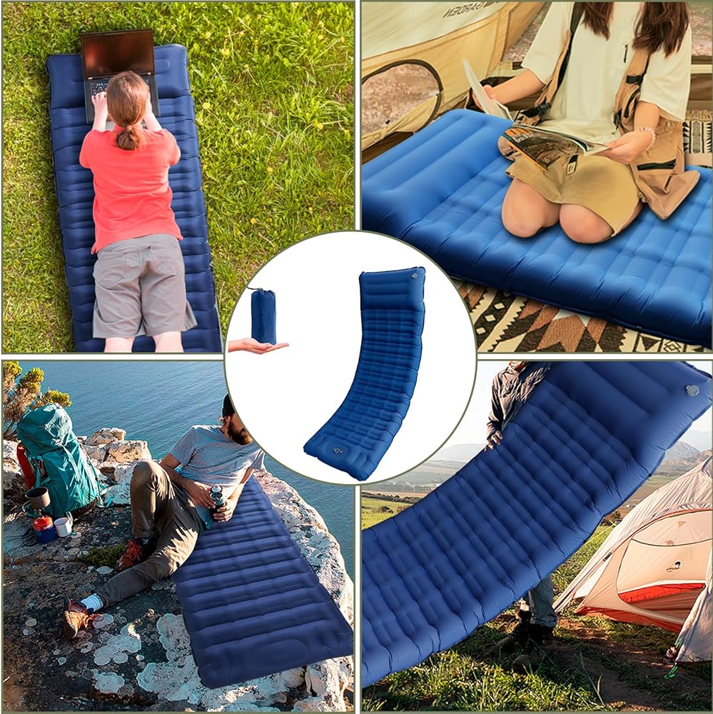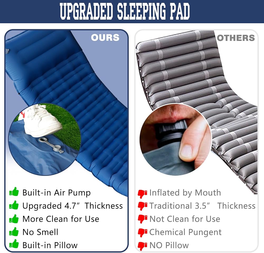 💦Built-in Foot Pump:The sleeping pad features a built-in foot pump, NO mouth blowing, no extra pump,no hands, clean and hygienic to make inflating this camping mattress a breeze. Two double layer valves on the pillow can effectively prevent air leakage and achieve rapid deflation,quick and easy inflation.(Only need 3 Minutes above)
