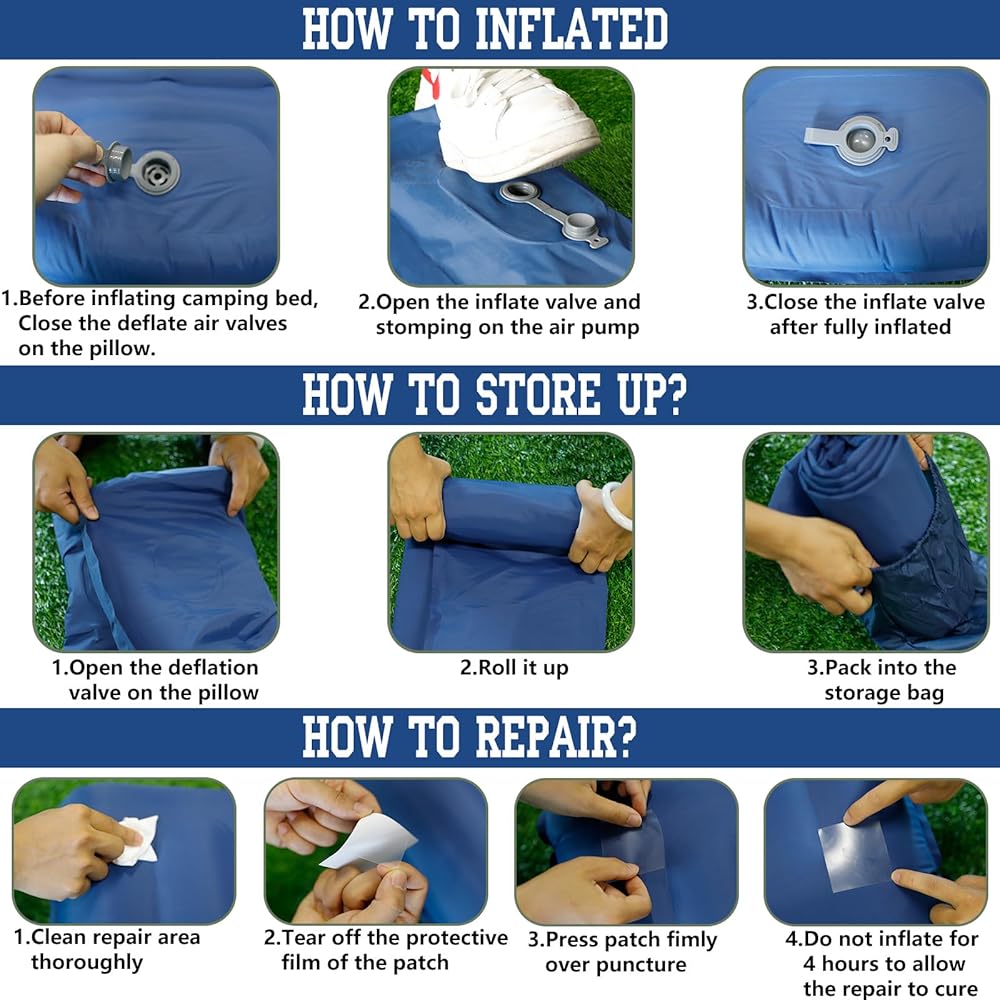 Packaging & Warranty: The camping mattress are packing with 1x Sleeping Pad; 1x Binging Belt; 1x Storage Bag; 1* Instruction; 3x Patch (When pad demaged , you could use it to repair, save your money); 👍We offer ONE YEAR item warranty, Free replacement or refund for defective,with a 100% satisfaction customer service for you.