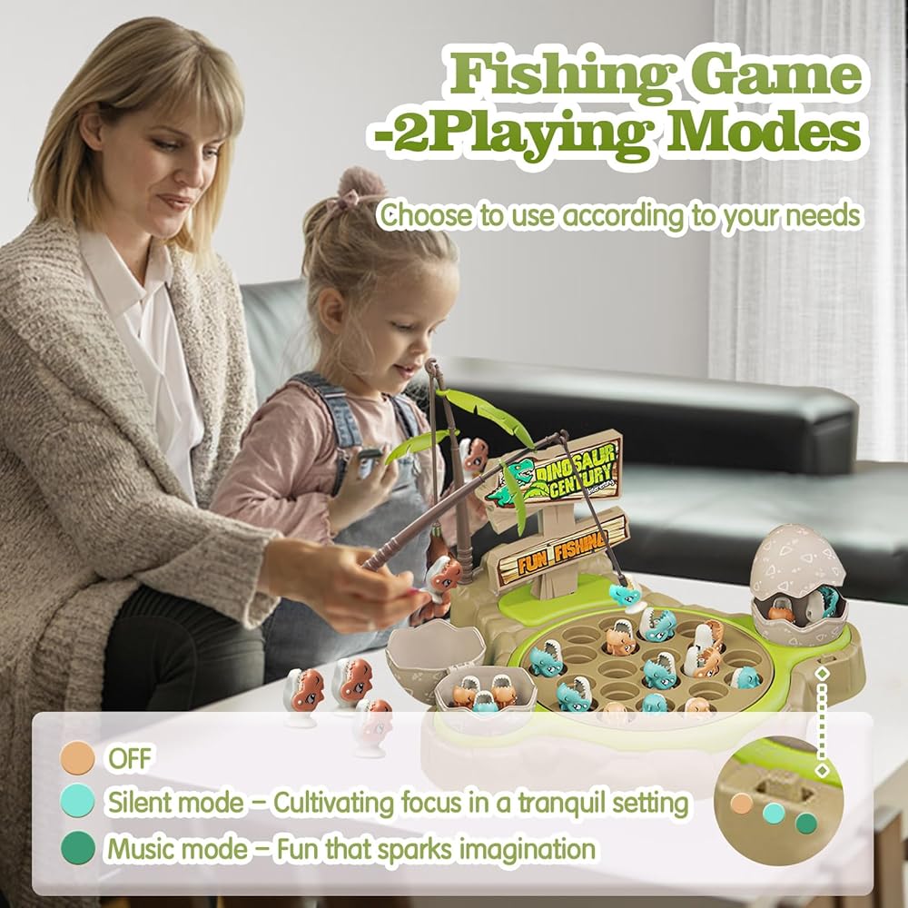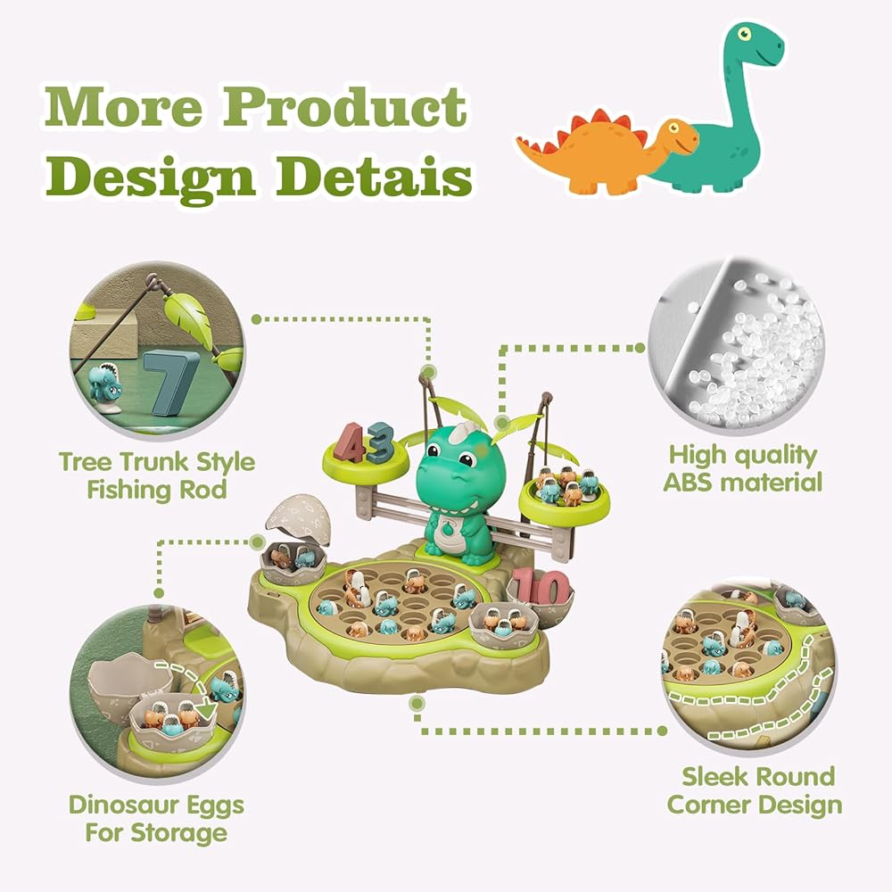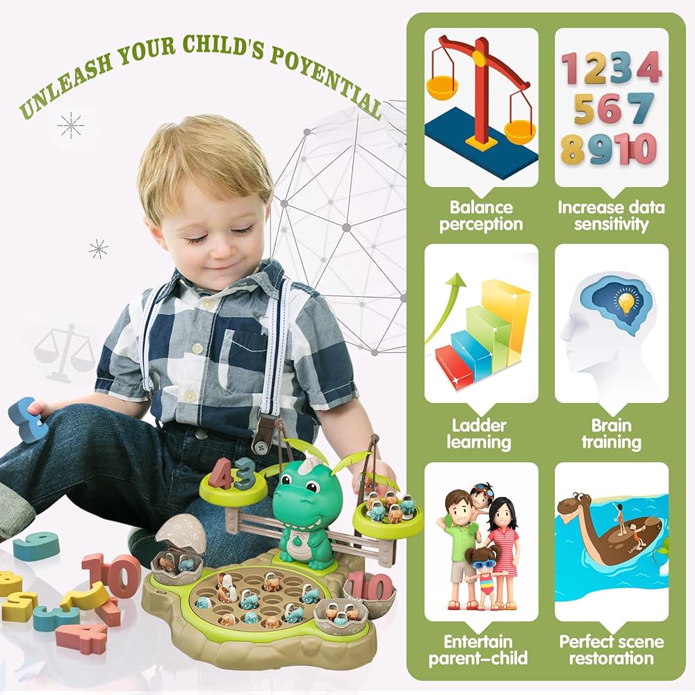 【Multiple Scene Mode Selection】This dinosaur balance math game and fishing toy offers two modes to choose from in fishing mode: silent mode and music mode. You can select the mode that suits your child's needs and preferences. In silent mode, children can focus on enjoying the fun and skills of fishing, while in music mode, lively music and sound effects add more joy and entertainment to the fishing experience.