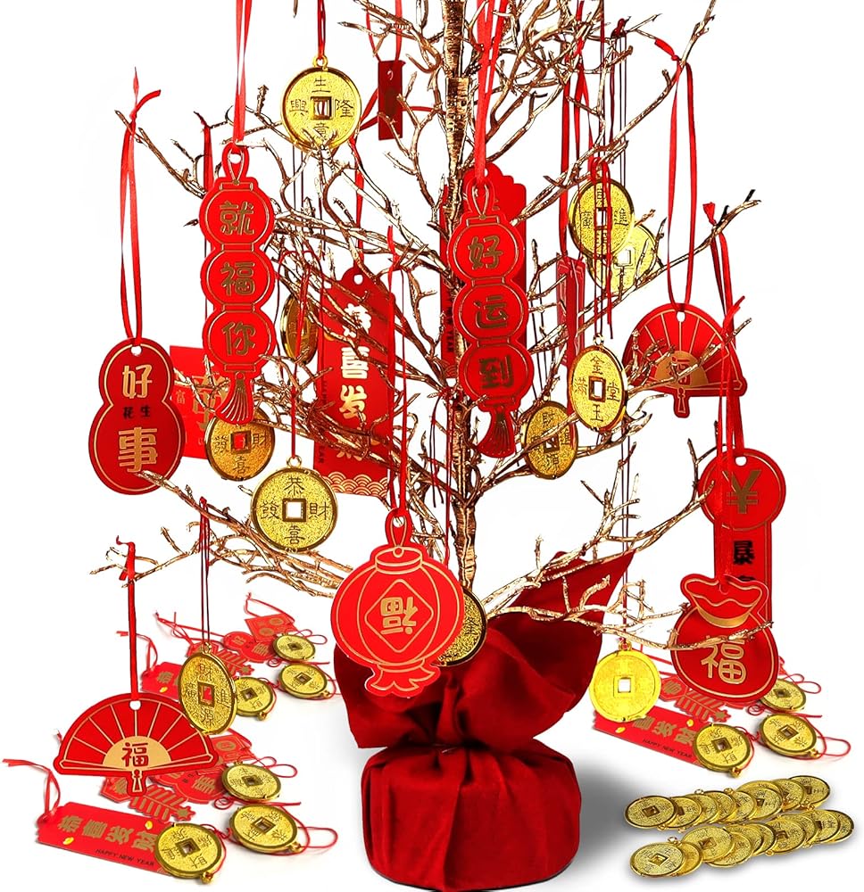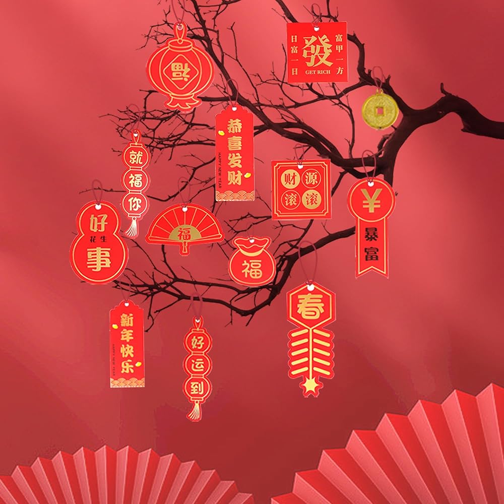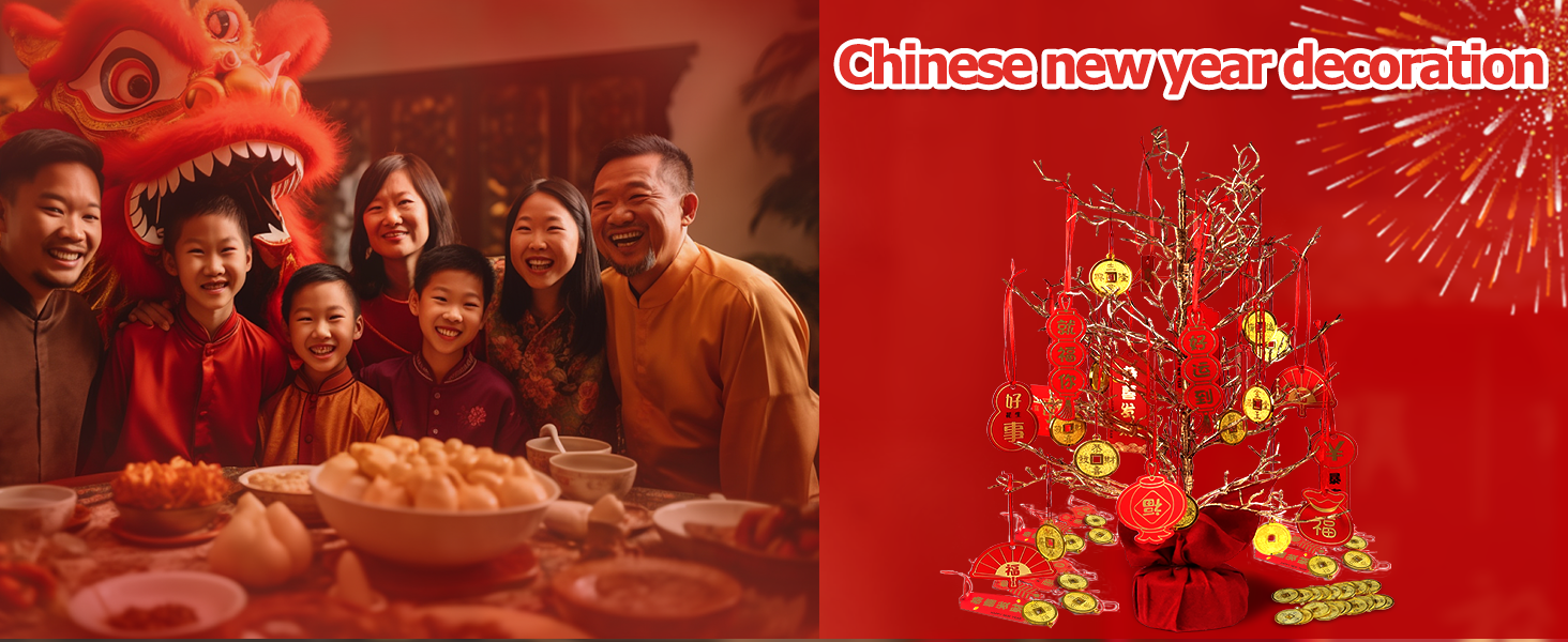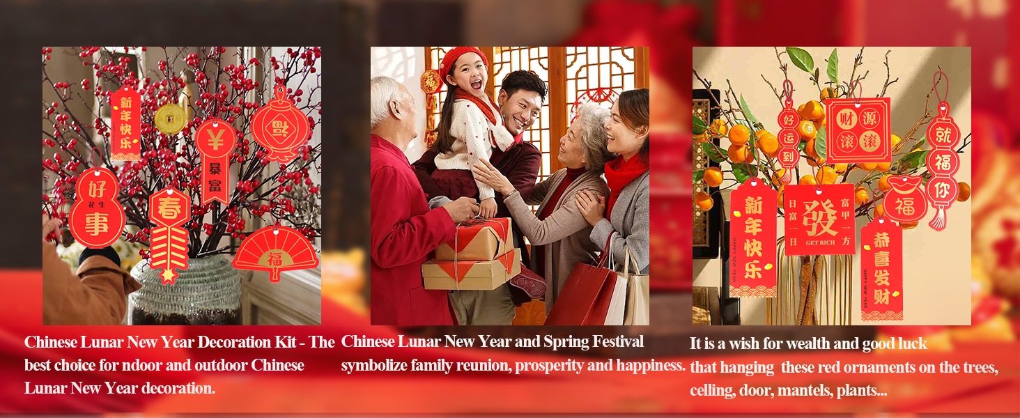 بدء رأس السنة الجديدة: خلال العام الصيني الجديد، نضع أو نعلق العديد من الديكورات بعناصر السنة الصينية الجديدة (عقدة صينية، مروحة صينية، قلادة فو، سبائك ذهبية، إلخ.) على الأبواب والنوافذ والأشجار وما إلى ذلك. وهذا يعني الصحة والسلام، والحظ السعيد، والحظ السعيد والازدهار، مما يخلق جوًا احتفاليًا قويًا للعام الصيني.