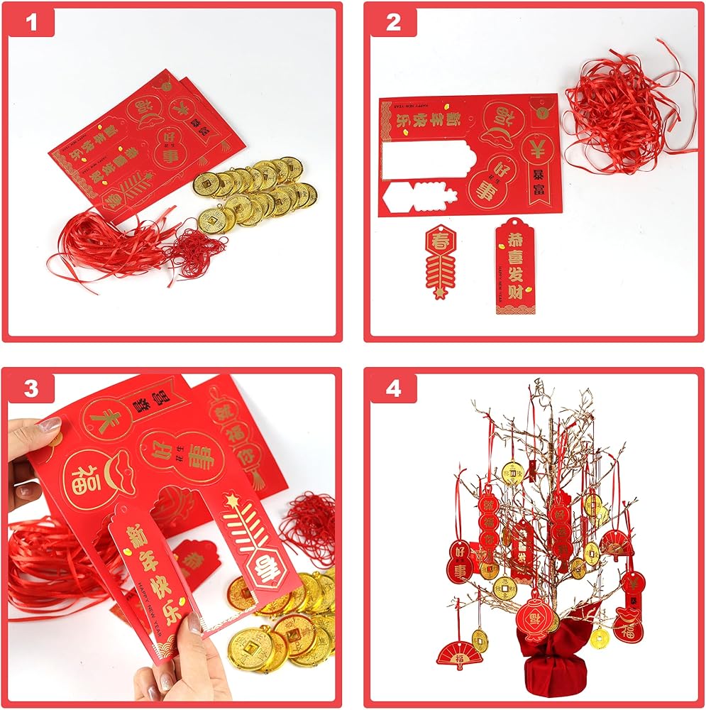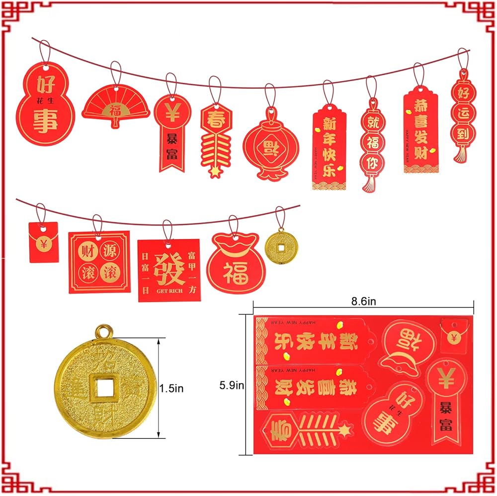 محتويات العبوة: سوف تحصل على 46 قطعة من زينة العام الصيني الجديد، تتضمن 26 قطعة من بطاقات المعايدة الصينية مع 13 نمطًا مختلفًا، 20 قطعة من العملات الذهبية ومجموعة من الأشرطة الحمراء. زينة رأس السنة الصينية الجديدة لعام 2023 مثالية لديكورات حفلات رأس السنة الصينية الجديدة، مليئة بأجواء رأس السنة الصينية الجديدة.
