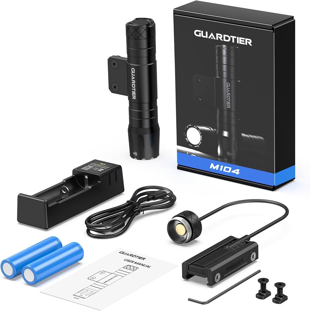 مصباح سلاح Guarditer M104 1200 لومن متوافق مع سكة M-Lok، مصباح يدوي تكتيكي قابل لإعادة الشحن مع مفتاح ضغط ولوحة تثبيت مثبتة على البندقية