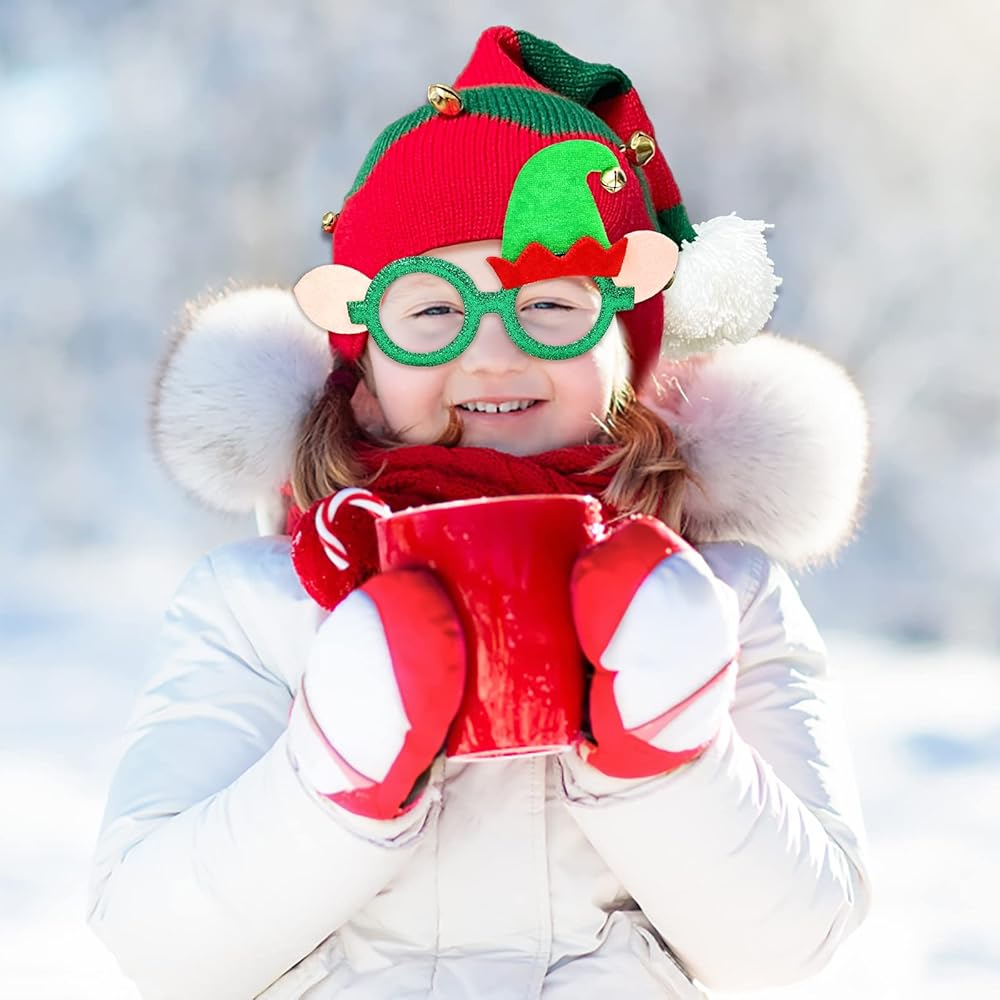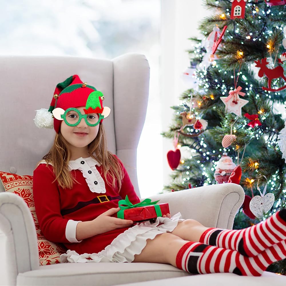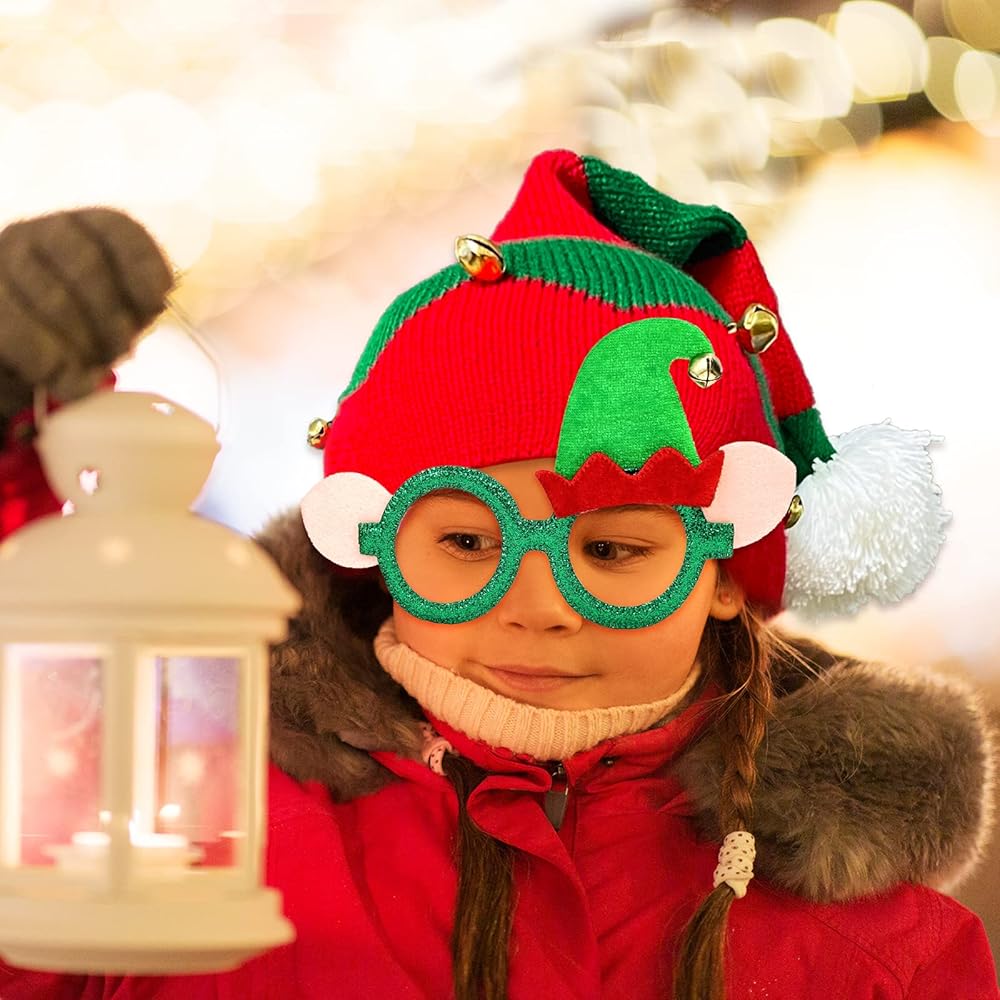 قبعة إلف كلاسيكية: تتضمن الحزمة 1 حزمة من قبعة عيد الميلاد المجيد من الكروشيه وزوج واحد من نظارات سانتا كلوز، مجموعة كلاسيكية حمراء وخضراء مع أجراس منقطة على قبعة قزم. مناسبة جدًا للأطفال لارتدائها في الكريسماس.