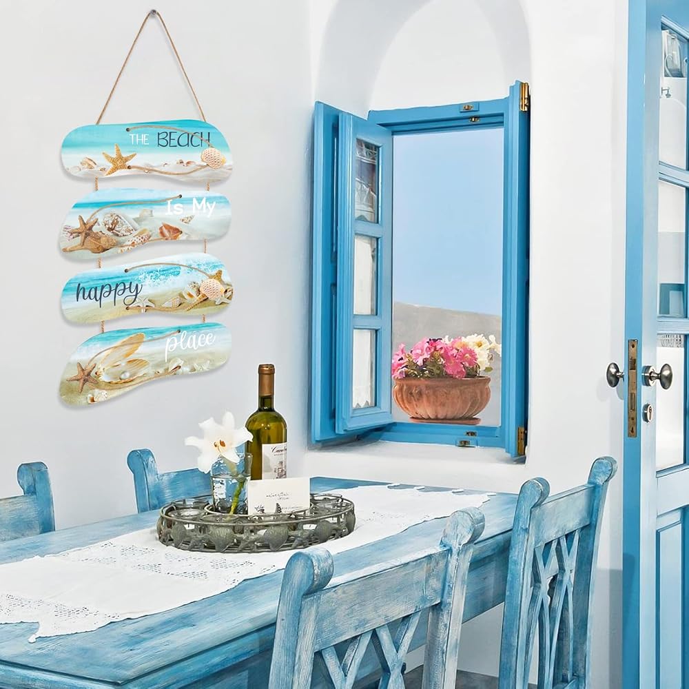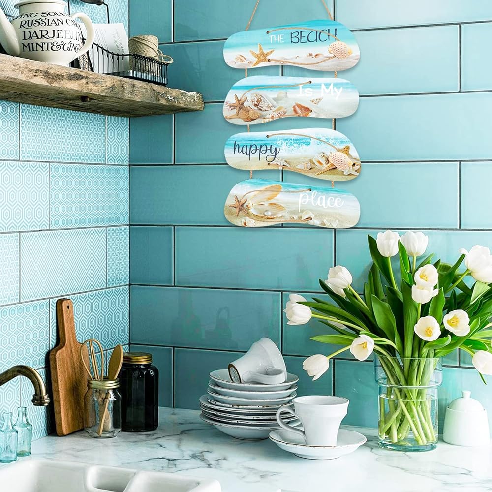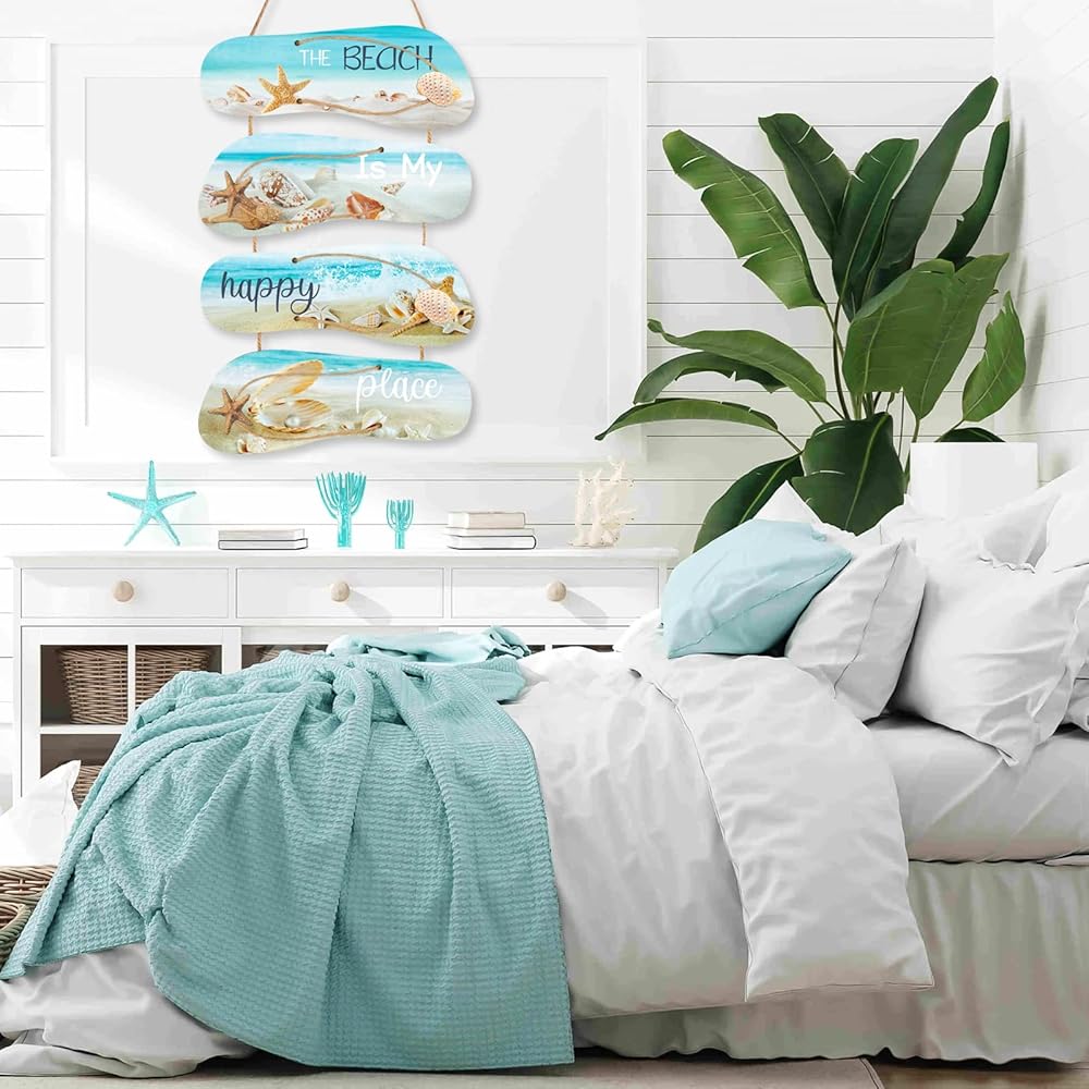 ✔【OCEAN HANGING DECOR】In this package, you will receive 4pcs 4.5" x 11.8" beach wall art that is 0.2" thick, with clear and elegant words: "The beach is my happy place," showing your yearning for a seaside holiday. They are pre-assembled and can be hung effortlessly in any desired position, bringing a fresh and free ocean atmosphere.