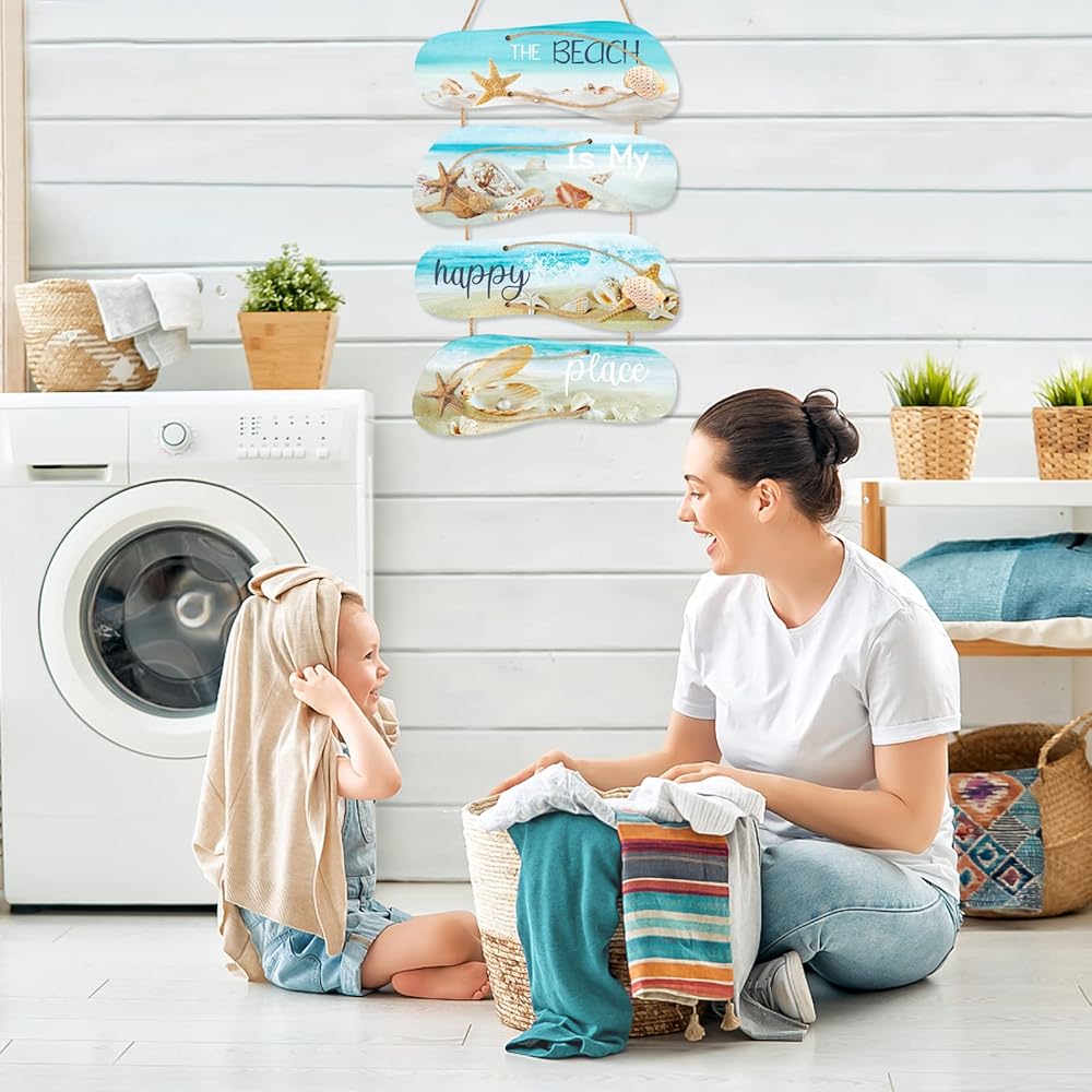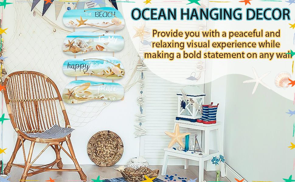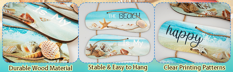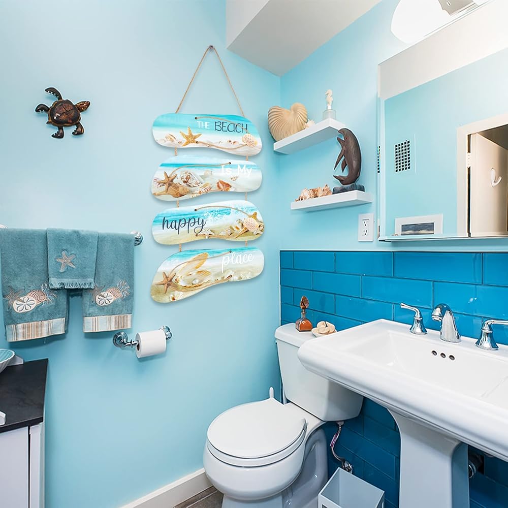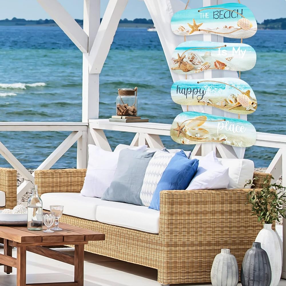 ✔【OCEAN HANGING DECOR】In this package, you will receive 4pcs 4.5" x 11.8" beach wall art that is 0.2" thick, with clear and elegant words: "The beach is my happy place," showing your yearning for a seaside holiday. They are pre-assembled and can be hung effortlessly in any desired position, bringing a fresh and free ocean atmosphere.