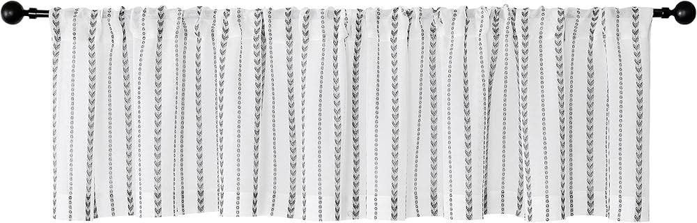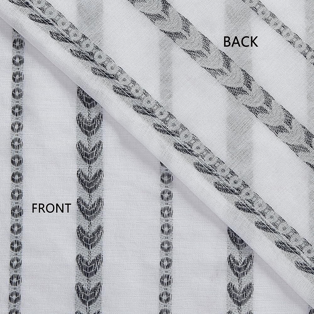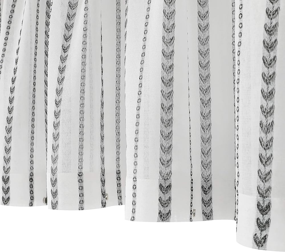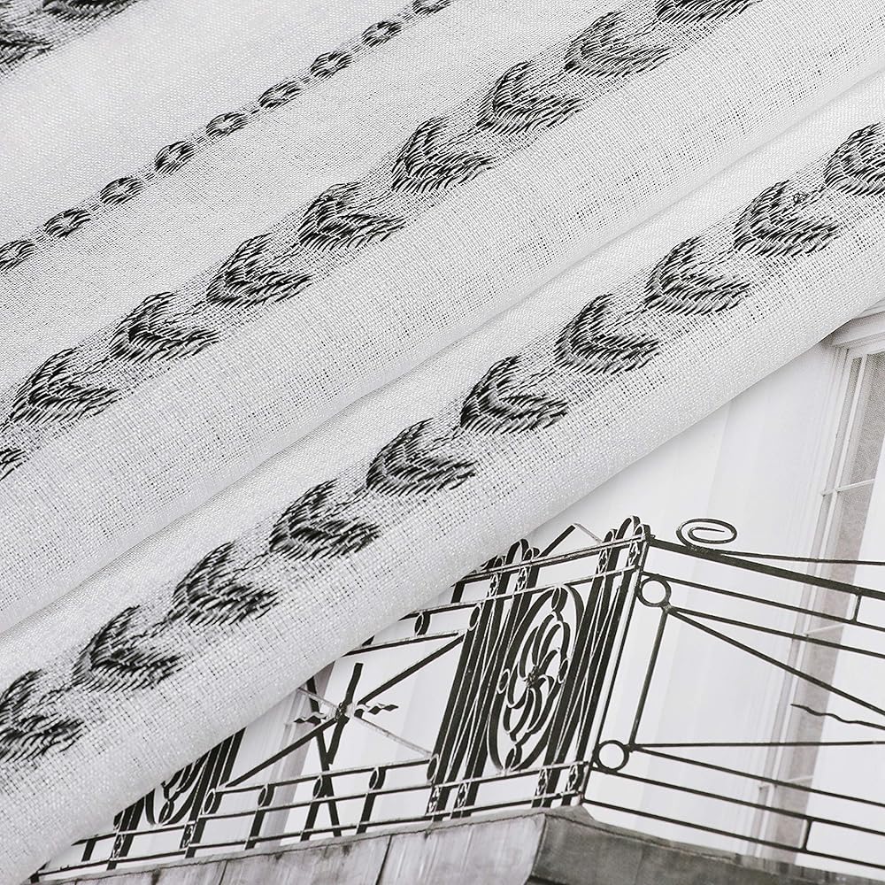 ستائر نافذة بيضاء شفافة بلوحة واحدة منسوجة من قماش الجاكار الهندسي. ستائر نافذة بيضاء شفافة بعرض 137.16 سم × طول 43.18 سم. مناسبة للتركيب في المطبخ والحمام والقبو وغرفة الغسيل.