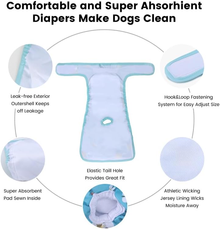 • مواد عالية الجودة: حفاضات الكلاب سهلة الارتداء والخلع مصنوعة من مواد ناعمة ومتينة تتحمل الغسيل المتكرر والاستخدام اليومي، مع مثبتات فيلكرو أوسع لحرية الحركة وسهولة الانزلاق.
