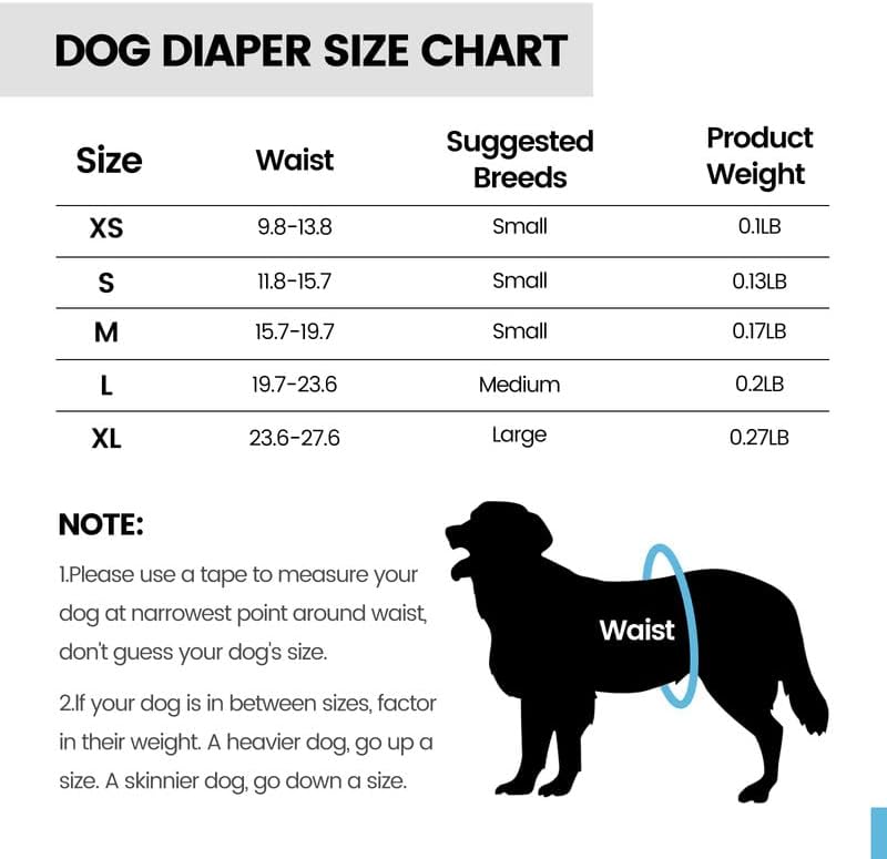 • مقاس قابل للتعديل: يناسب أنواع الجسم المختلفة. يرجى قياس خصر كلبك مباشرة أمام الأرجل الخلفية ومقارنته بجدول المقاسات الخاص بنا لضمان أفضل ملاءمة لطفلك. إذا كان كلبك يقع بين مقاسين، فضع في اعتبارك وزنه. للكلاب الأثقل، اختر مقاسًا أكبر بدرجة واحدة. بالنسبة للكلاب الرقيقة، قم بتخفيض الحجم.