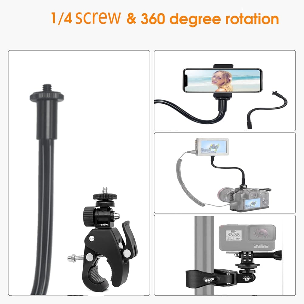 • رأس دوار 1/4 انش، ذراع أنبوب عنق الإوزة المرن للكاميرا مع برغي 1/4 انش في الأعلى وأيضًا في النهاية، يمكنك توصيله بحرية مع أجهزة مختلفة.
