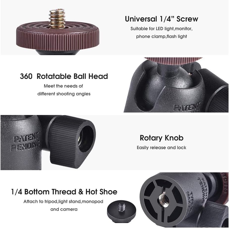 • رأس كروي قابل للدوران 360 درجة 360 درجة بتصميم رأس كروي دوار مثالي لتدوير هاتفك إلى وضع عمودي (رأسي) أو وضع أفقي (أفقي). مقبض دوار يمكن تحريره وقفله بسهولة، مريح للغاية للتصوير بزوايا مختلفة.