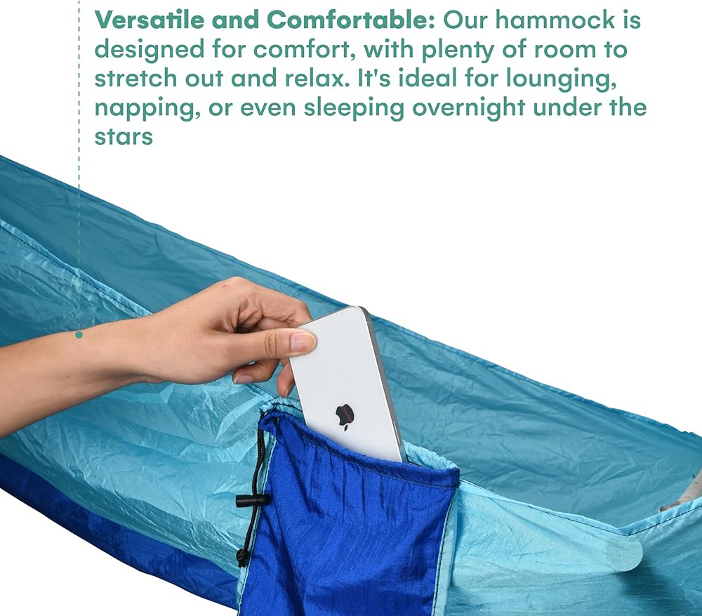 استمتع بالاسترخاء المطلق أثناء التنقل مع أرجوحة التخييم اوتليري الخاصة بنا. هذه الأرجوحة خفيفة الوزن وصغيرة الحجم سهلة الحمل، مما يجعلها مثالية لحقيبة الظهر أو التخييم أو الاستمتاع بالفناء الخلفي. مصنوعة من مواد عالية الجودة ودرزات ثلاثية الخياطة، تضمن المتانة والراحة طويلة الأمد لجميع مغامراتك الخارجية. الإعداد سهل مع أحزمة الشجرة وحلقات التثبيت المتضمنة، مما يوفر سهولة الإعداد والتنوع لجميع احتياجات الاسترخاء في الهواء الطلق. توفر الأرجوحة المحمولة ذات الحجم الكبير 55 انش طول × 106 انش عرض مساحة واسعة وراحة فائقة، مما يسمح لك بالاسترخاء وتحسين تجربة الاسترخاء. أرجوحة الشجرة الخاصة بنا رفيق موثوق به، مصممة لتكون شريكك الموثوق به في الاسترخاء في الهواء الطلق. يضمن هيكلها الموثوق وتصميمها المريح تجربة ممتعة في كل مرة.