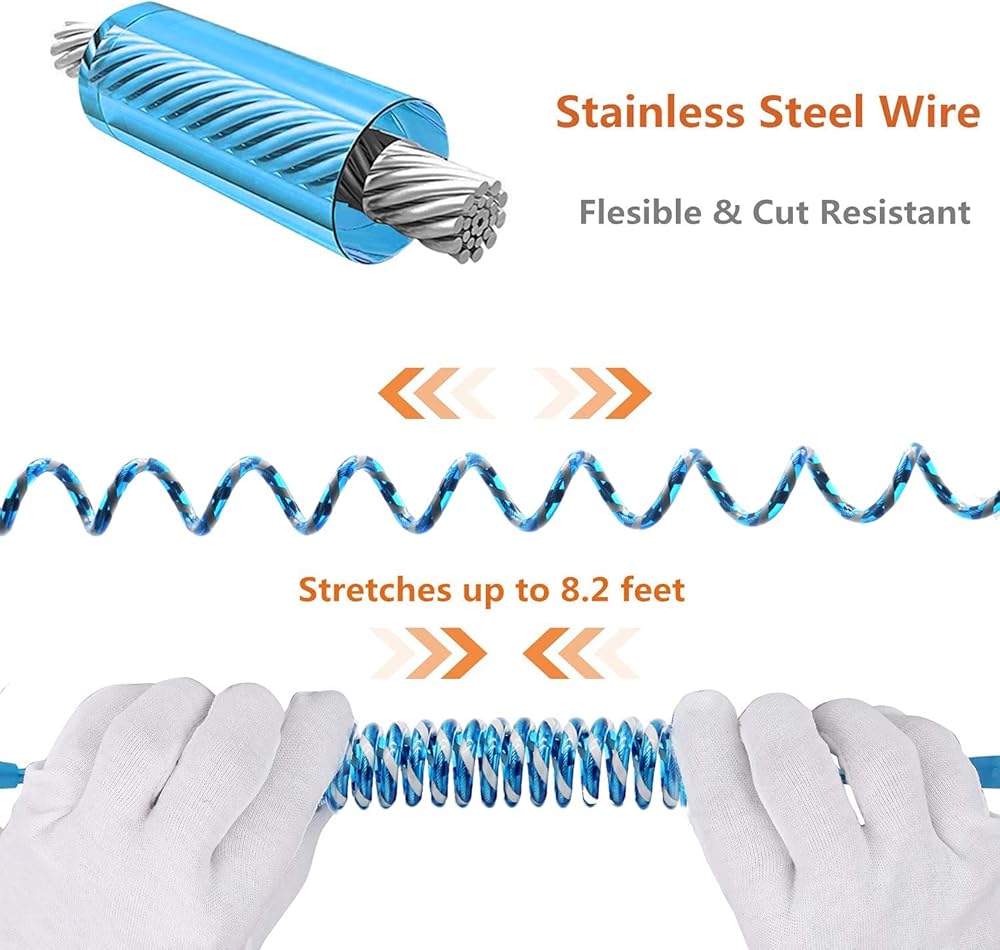 متينة: حبل التوصيل مصنوع من الفولاذ المقاوم للصدأ ومغلف بالبلاستيك، لا تقلق أبدًا من أن يتم قطع حزام الأمان هذا بالسكين. وهو مرتبط بأحزمة المعصم بموصلات معدنية يمكن أن تدور بحرية 360 درجة