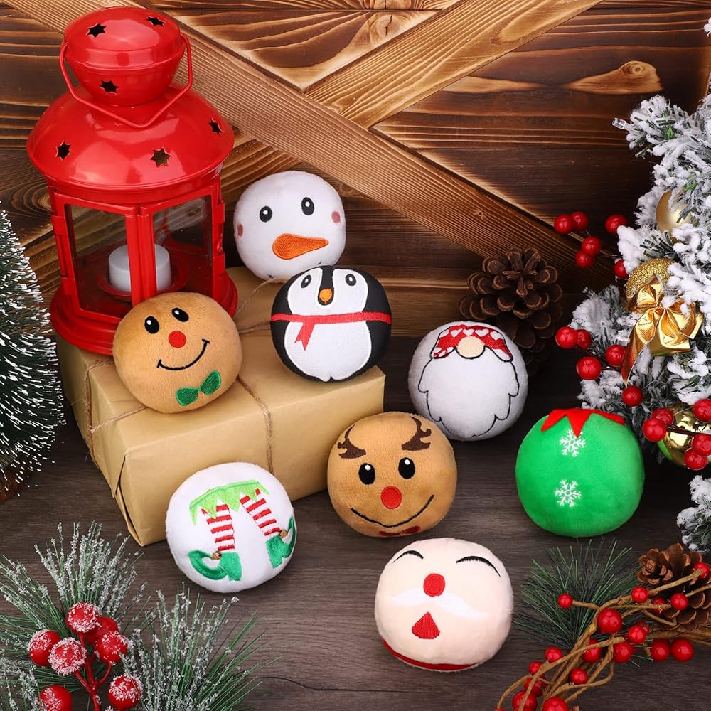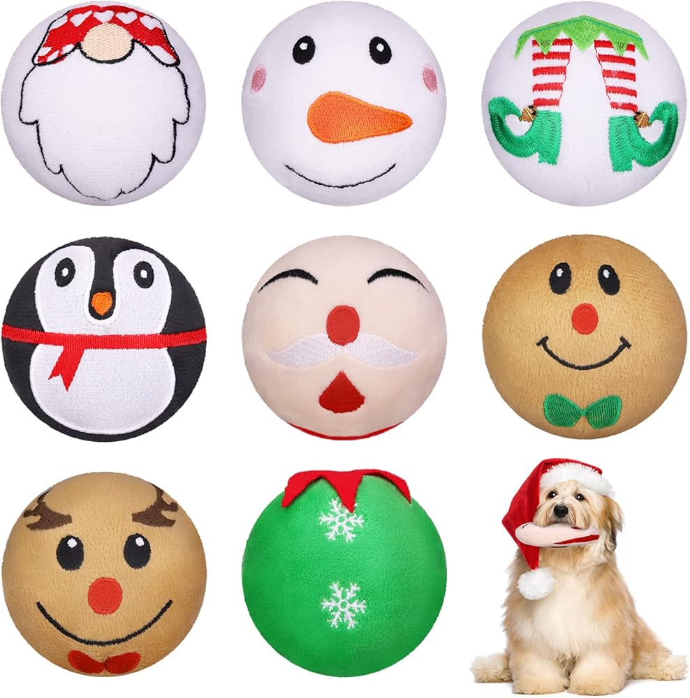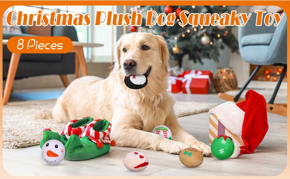 What you will get: the package comes with 8 pieces of Christmas plush dog squeaky toys in 8 different styles, including Santa Claus, snowman, gingerbread man, penguin, elk, elf, goblin, Christmas tree