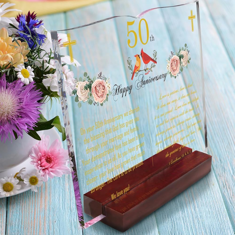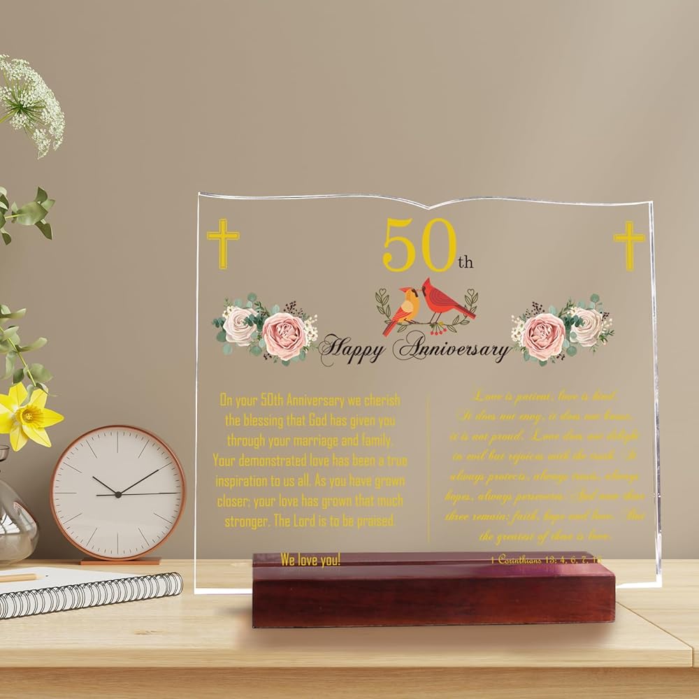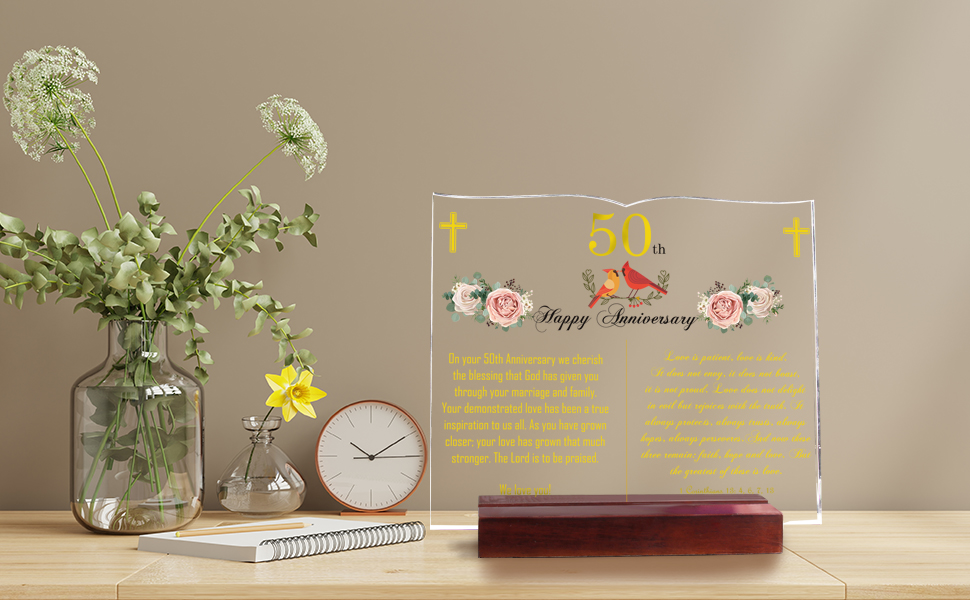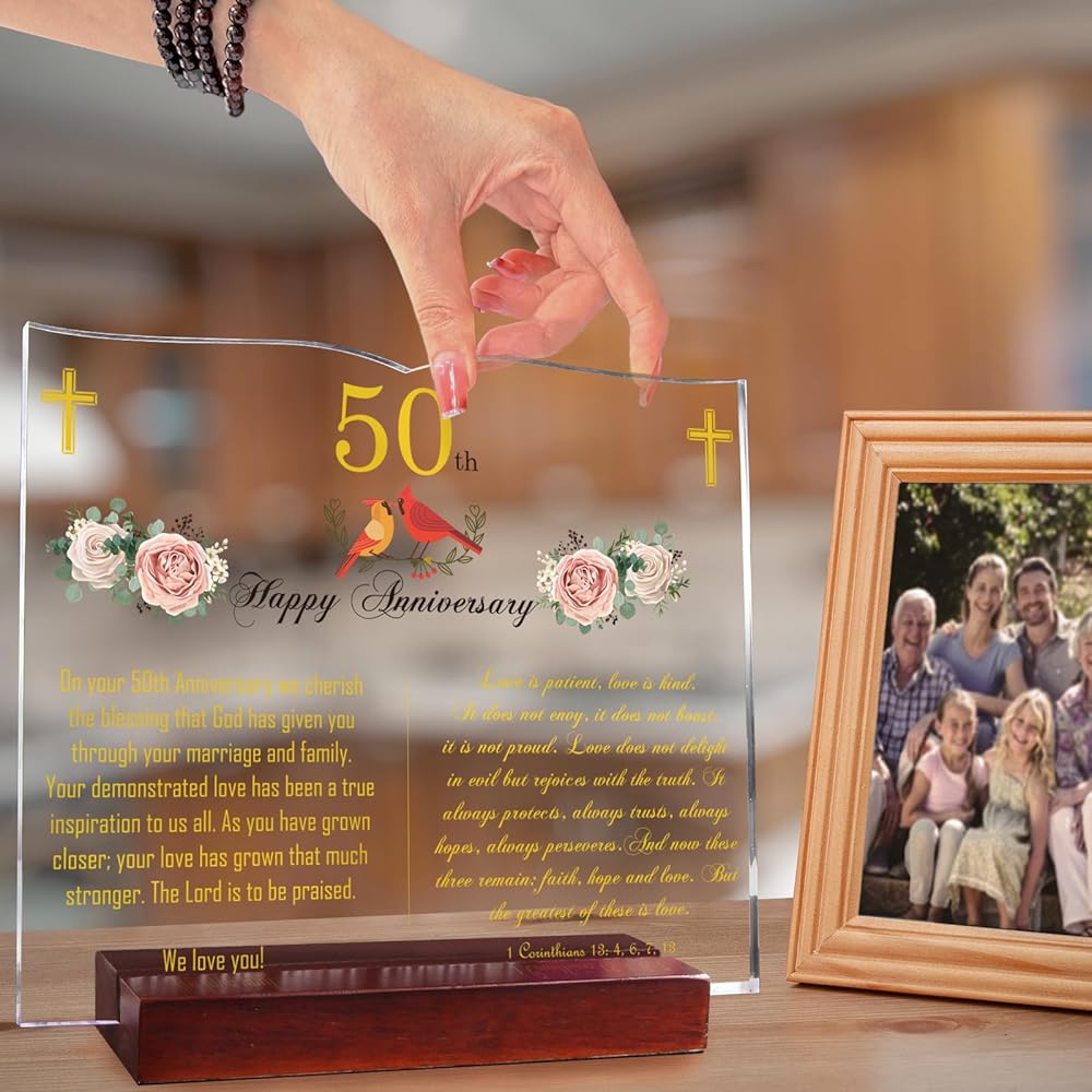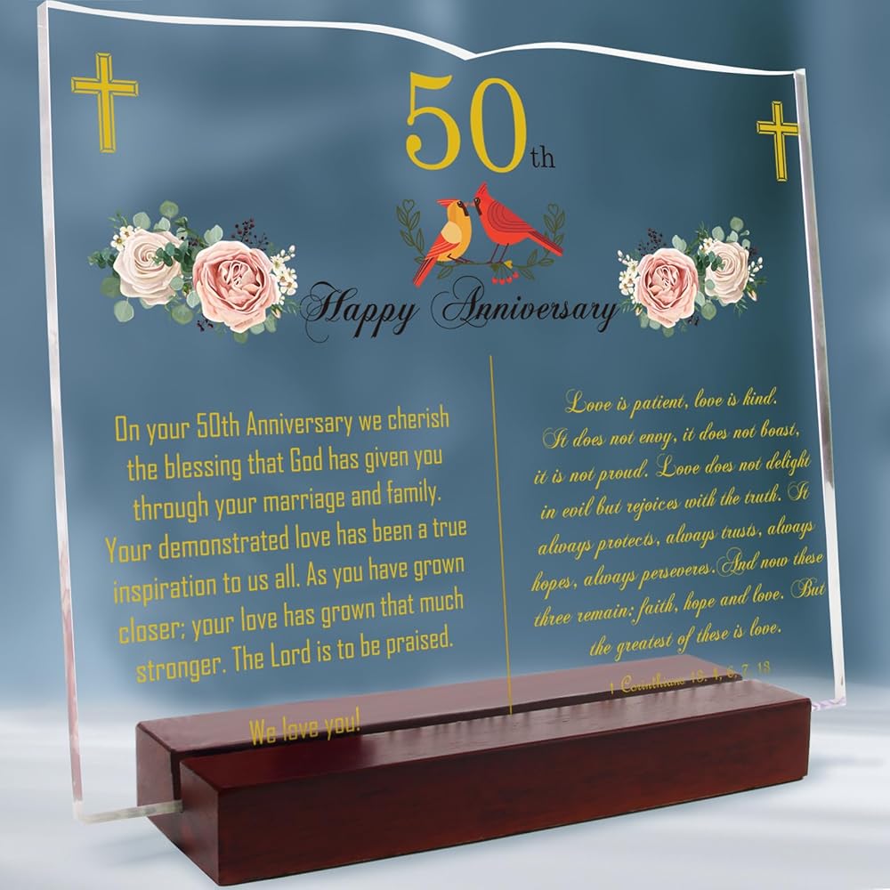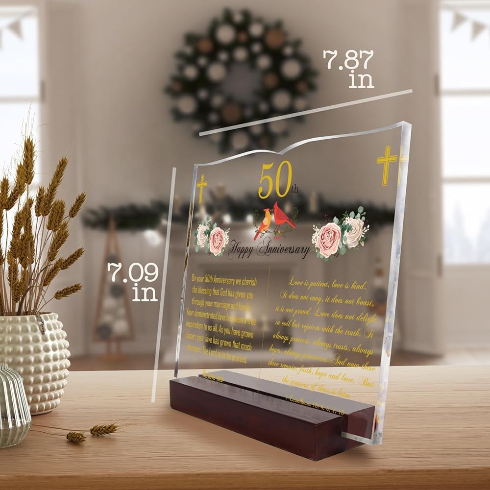 أفكار هدايا الذكرى السنوية الخمسين للزفاف: مصنوعة من الأكريليك والخشب المطاطي عالي الجودة، هذه الزخرفة متينة وتدوم طويلاً. تضمن القاعدة المتينة الثبات وتمنع الزينة من السقوط.