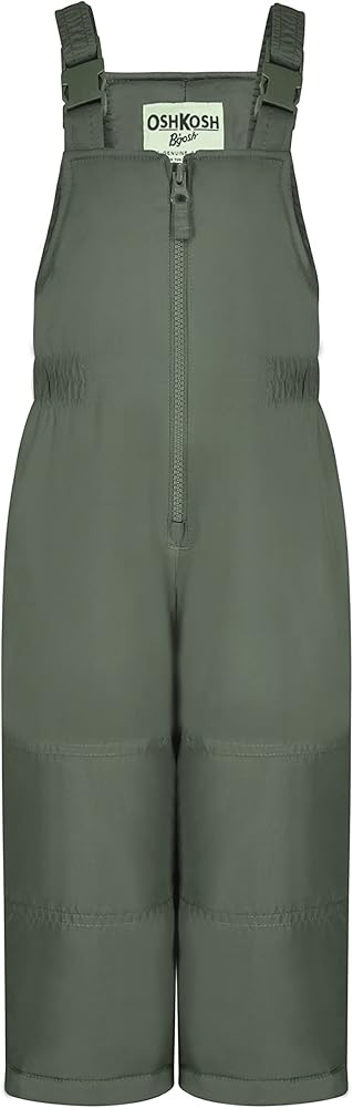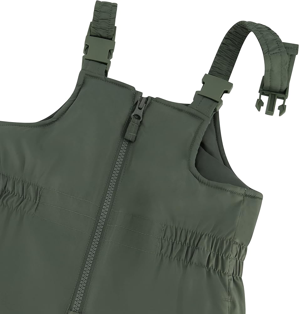Toddler snowpants bib is water-resistant, has adjustable shoulder straps, ankle gaiters to keep moisture out, and an elastic waist for added fit