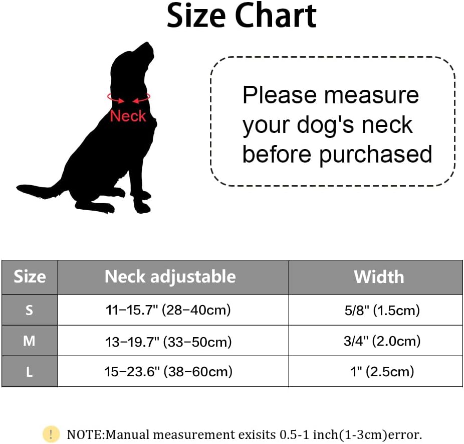 • 【حجم أطواق الكلاب قابل للتعديل】تتوفر 3 مقاسات صغيرة ومتوسطة وكبيرة. طوق كلب صغير يناسب الرقبة مقاس 11 بوصة إلى 15.7 بوصة وعرض 5/8 بوصة. طوق كلب متوسط ​​الحجم يناسب الرقبة مقاس 13 بوصة - 19.7 بوصة وعرض 3/4 بوصة. طوق كلب كبير يناسب الرقبة مقاس 15 بوصة - 23.6 بوصة وعرض 1 بوصة. يرجى قياس رقبة كلبك لضمان ملاءمة مثالية. القاعدة العامة هي أن إصبعين يجب أن ينزلقا بسهولة أسفل أطواق الكلاب.