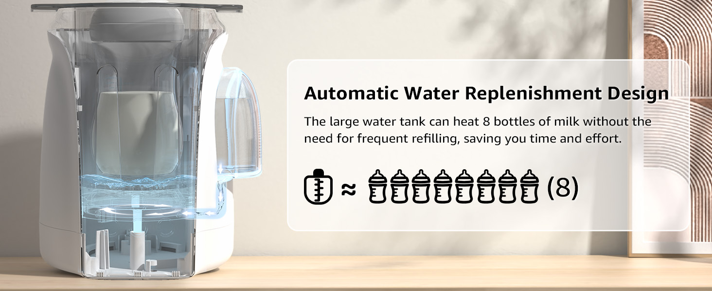 【إعادة تعبئة المياه تلقائيًا】يمكن لخزان المياه الواسع القابل للفصل أن يستوعب كمية كافية من الماء لتسخين ما يصل إلى 8 زجاجات من الحليب، مما يقلل بشكل كبير من الإزعاج الناتج عن عمليات إعادة التعبئة المتعددة. يتيح خزان المياه الشفاف إمكانية مراقبة مستوى المياه بسهولة، مما يضمن إعادة التعبئة السريعة. في HAUTURE، نحن ملتزمون بصناعة جهاز تدفئة الزجاجات مصمم لتعزيز الراحة في حياتك اليومية.
