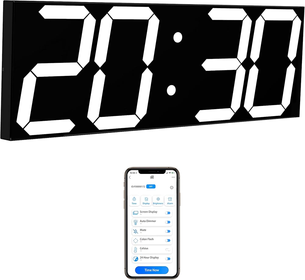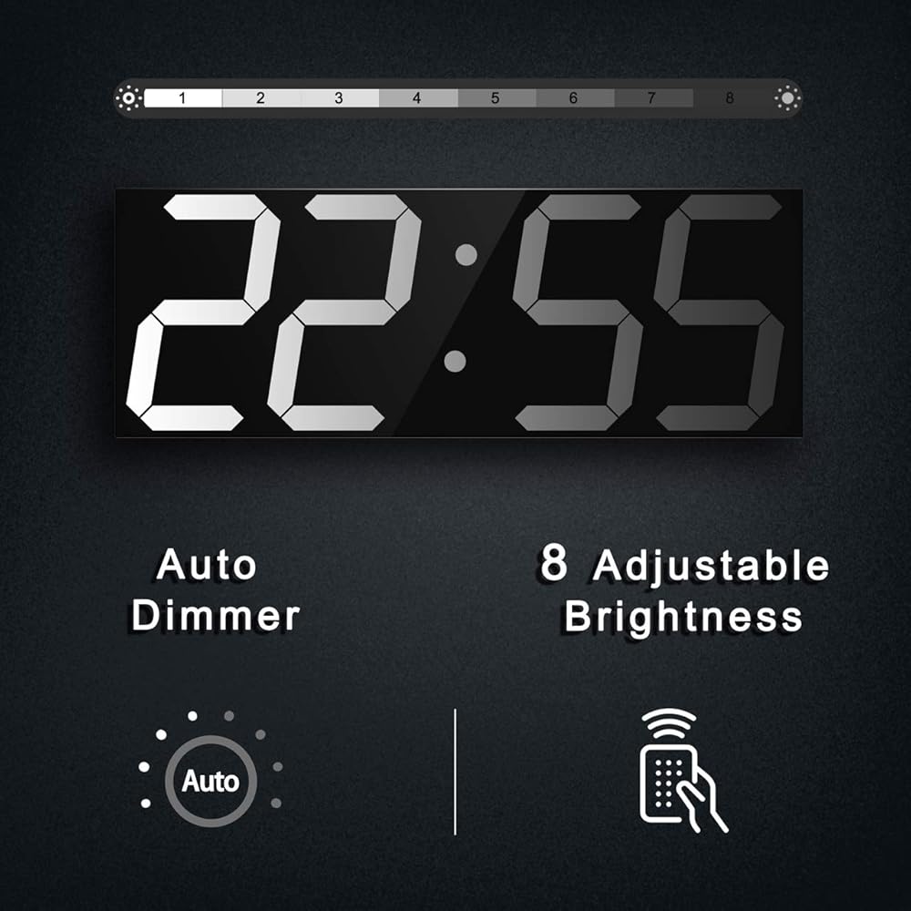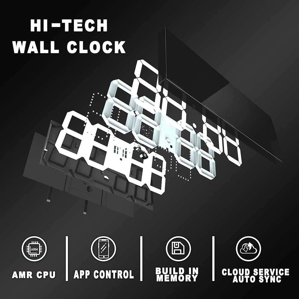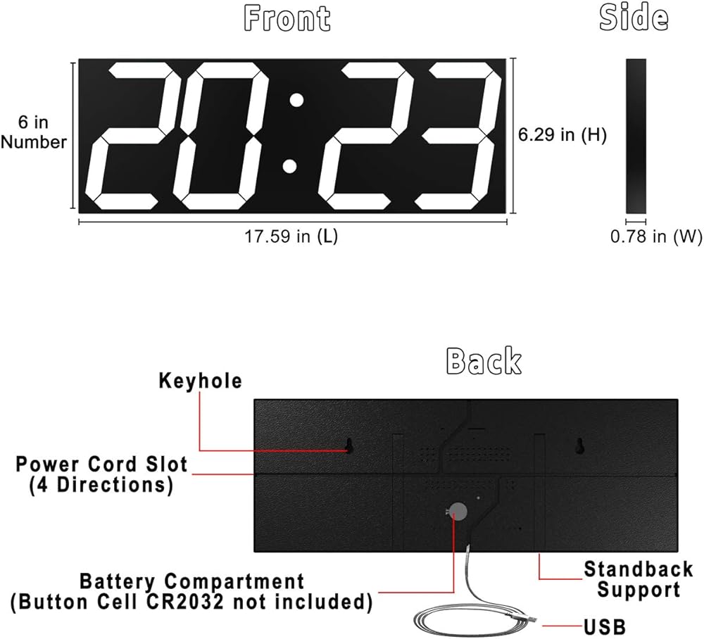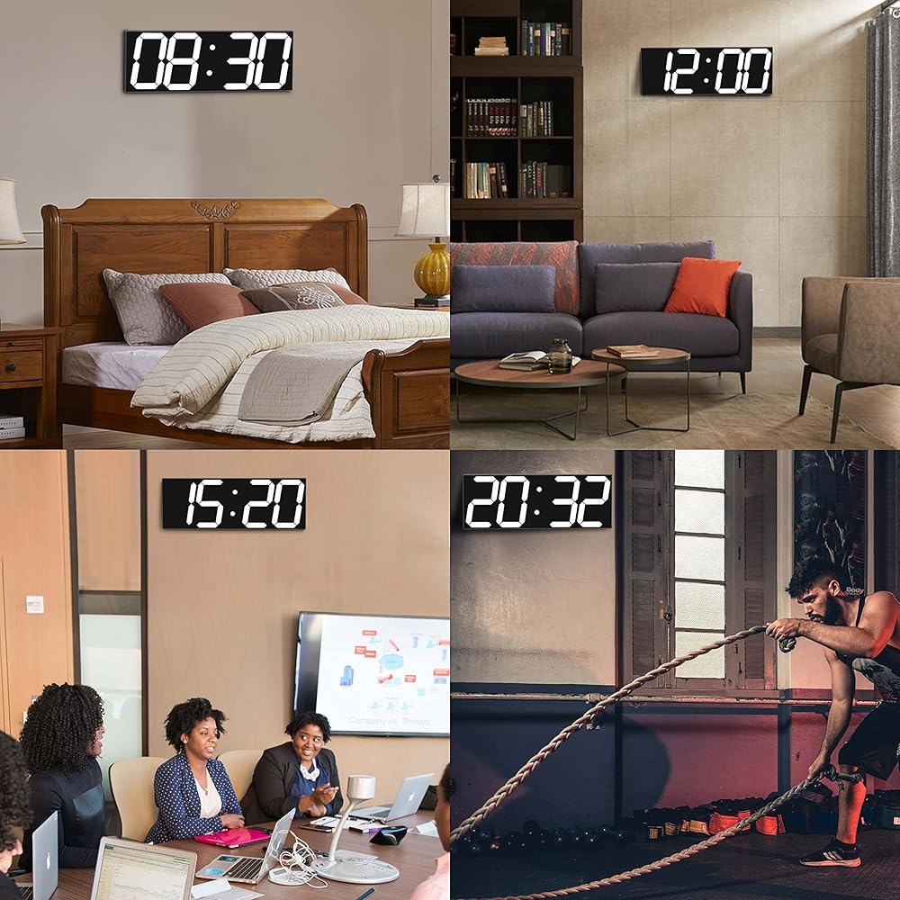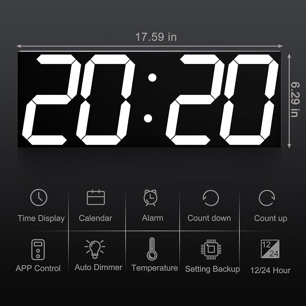 ساعة حائط رقمية كبيرة متعددة الوظائف: عرض عدد كبير من الوقت، الشكل 6 بوصة مرئي بوضوح شديد. مؤقت رقمي كبير مع وظائف التنبيه والكليندار والعد التنازلي وساعة التوقف، وكابل USB بطول 9.8 قدم لخيارات الطاقة المختلفة ومناسب للعديد من المناسبات المختلفة.