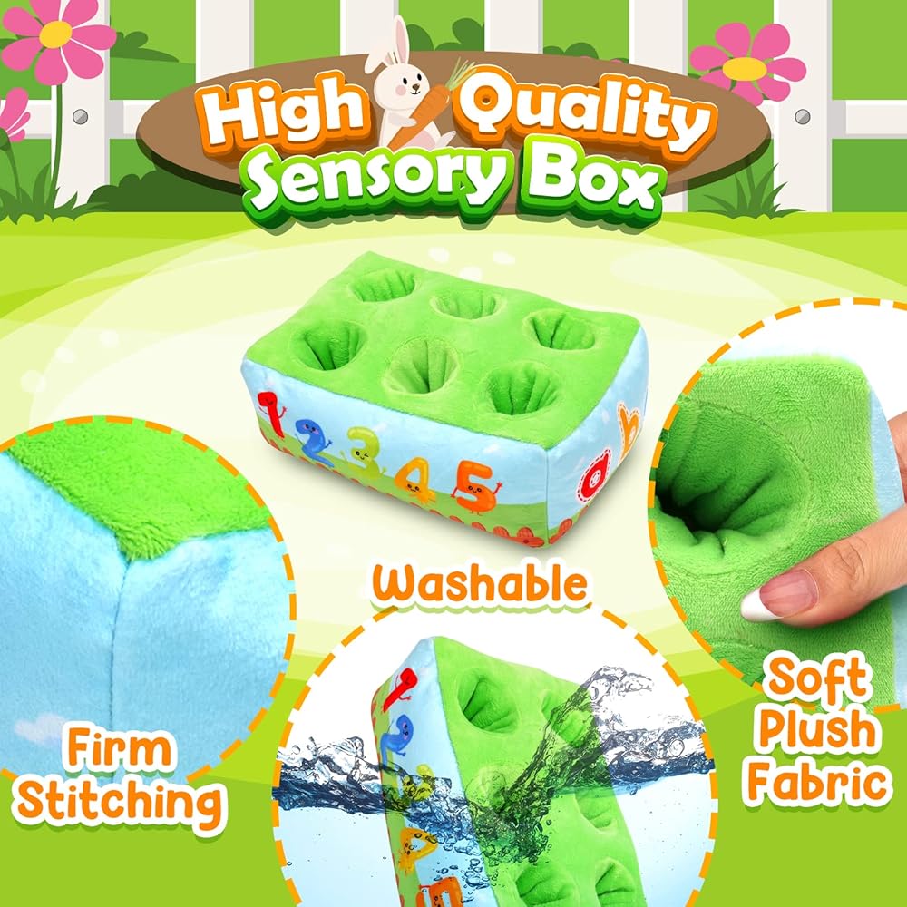 【مادة فائقة النعومة】مصنوعة من نسيج قطيفة صديق للبشرة وعديم الرائحة، مثالية للأولاد والبنات من سن 6 أشهر فما فوق. تمت حياكته بإحكام، وملمس ناعم وقابل للغسل، ومصمم لتوفير بيئة لعب آمنة لطفلك الصغير. صندوقنا الحسي مغطى بأنماط وألوان نابضة بالحياة من كل جانب، مما يوفر ساعات من الترفيه لطفلك. لا تفوت هذه اللعبة التي يجب اقتناؤها للنمو الحسي لطفلك!