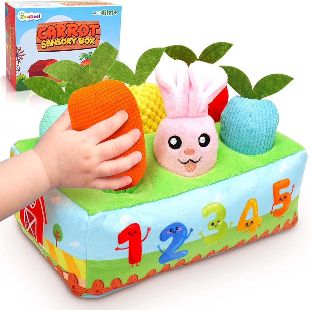 【تنمية حسية متنوعة للطفل】توفر لعبة الطفل الحسية هذه مجموعة متنوعة من الأنسجة القطيفة والقماش بألوان مختلفة تؤدي إلى تطوير مهارات الطفل الحسية والحركية. قم بالضغط على الفجل والأرنب لإصدار أصوات مزخرفة تنمي الحواس السمعية لدى طفلك. سوف يحافظ الصندوق على شكله جيدًا ولن ينهار. سهلة التنظيف والحمل. لعبة حسية مثالية لتحفيز نمو طفلك اللمسي والسمعي والبصري!