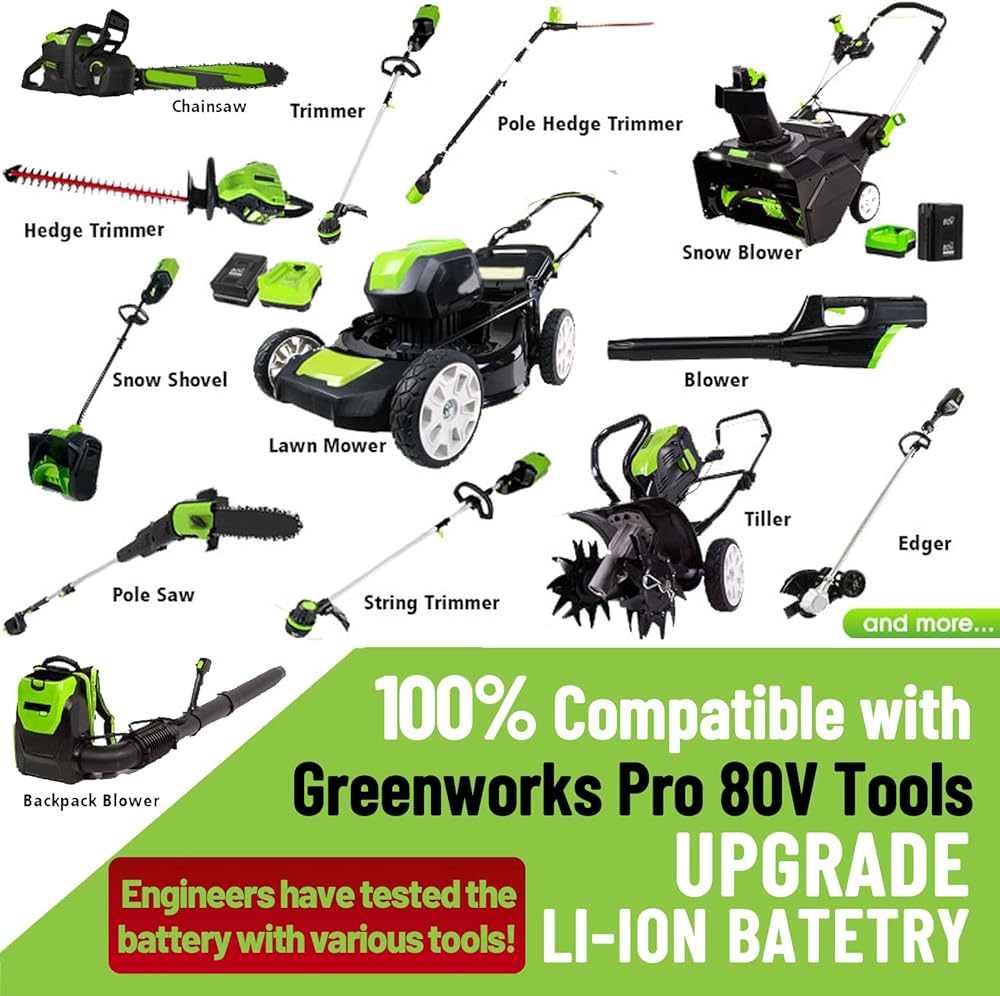 • ✔【توافق واسع النطاق وملاءمة سلسة】توافق البطارية - الإصدار الجديد! هذه البطارية البديلة متوافقة مع جميع أدوات Greenworks 80 فولت، مثل الجزازة، والمنشار الكهربائي، والمثقاب، والمنشار القطبي...