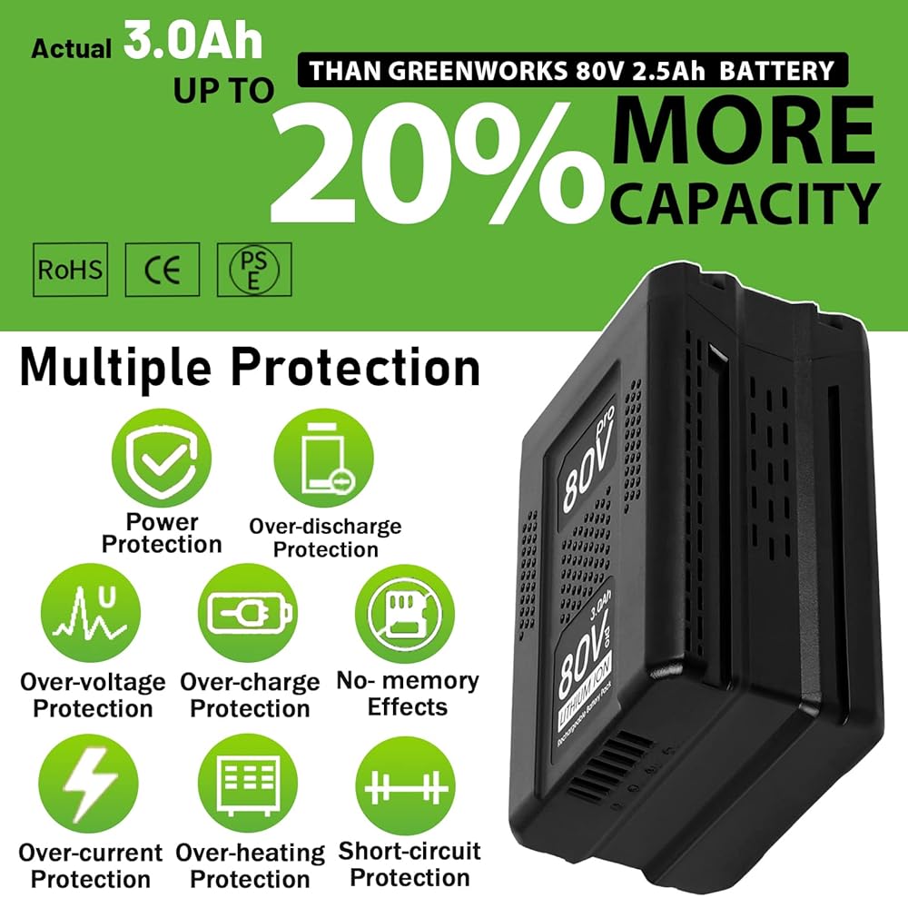 • ✔【 ما تحصل عليه?】بطارية بديلة 1* 3.0 أمبير لبطارية Greenworks Pro 80V + 1* دليل المستخدم + خدمة ممتازة: {استرداد مجاني أو استبدال لمدة 1.5 عام!!} و {خدمة ما بعد البيع سريعة على مدار 24*7 ساعات. }