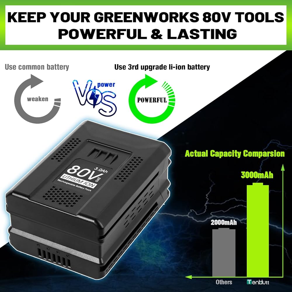 الجيل الثالث: بطارية بديلة 3.0 أمبير 80 فولت لبطارية Greenworks 80 فولت بحد أقصى بطارية ليثيوم طويلة Pro GBA80200 GBA80250 GBA80400 GBA80500 لأداة الطاقة اللاسلكية Greenworks 80V (فقط لـ Greenworks)