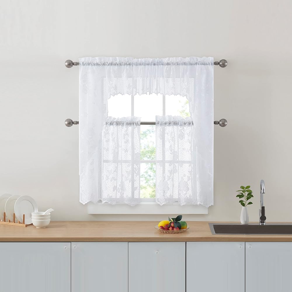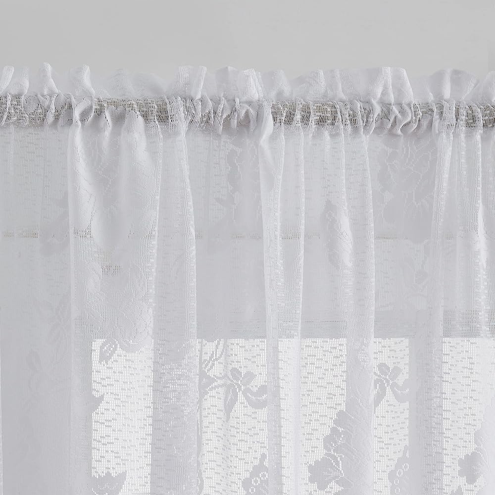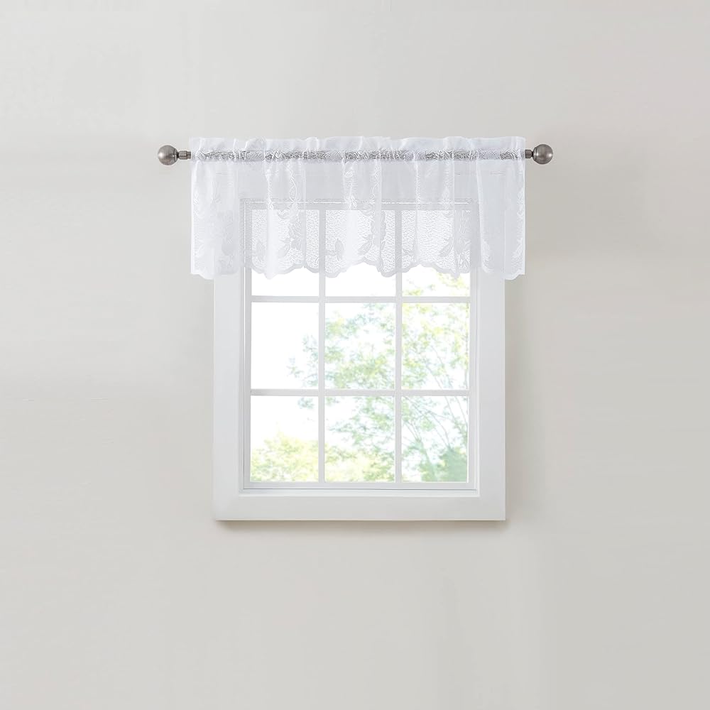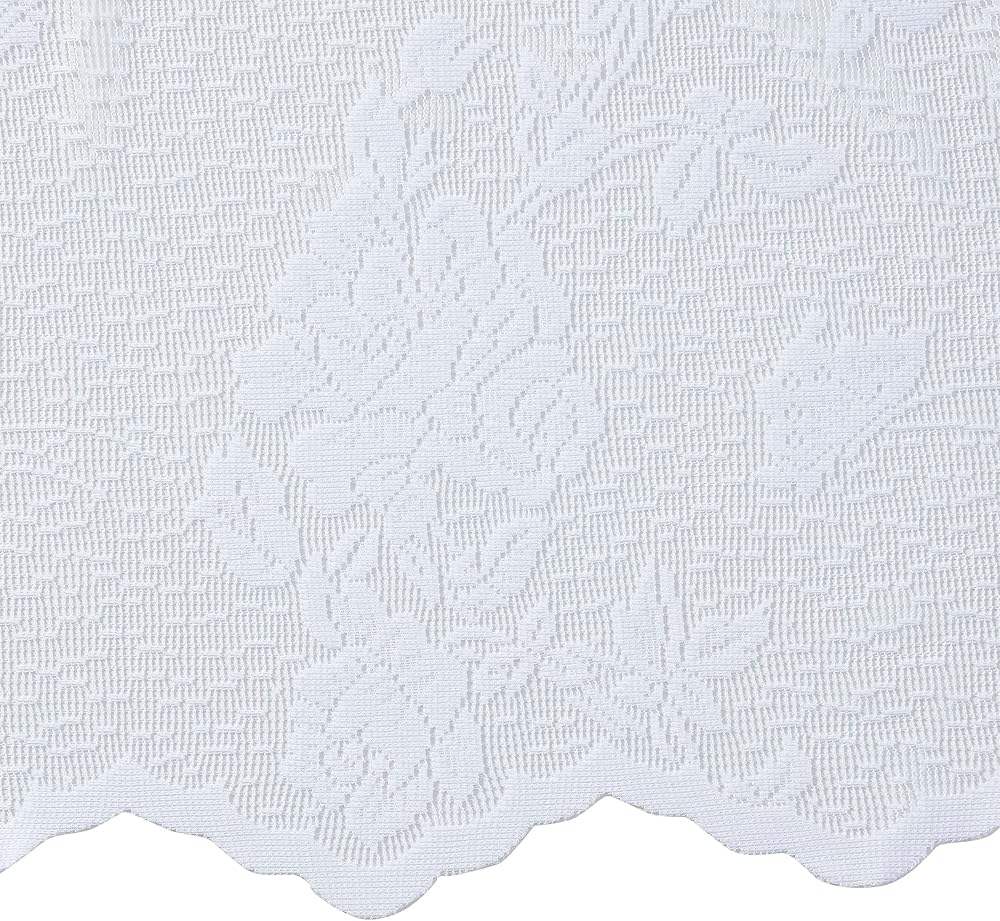 RENAISSANCE HOME FASHION Lacey is an attractive embroidered lace valance. Our Lacey valance can be hung on its own or paired with our Lacey tiers and swags. The valances are wide width measuring 58" wide and 12" in length. Available in Beige and White. Care Instructions: Machine wash cold. Delicate cycle. Wash separately. Use mild soap. Do not bleach. Tumble dry low. Iron at low temperature if needed. All items are sold separately. Made in China.