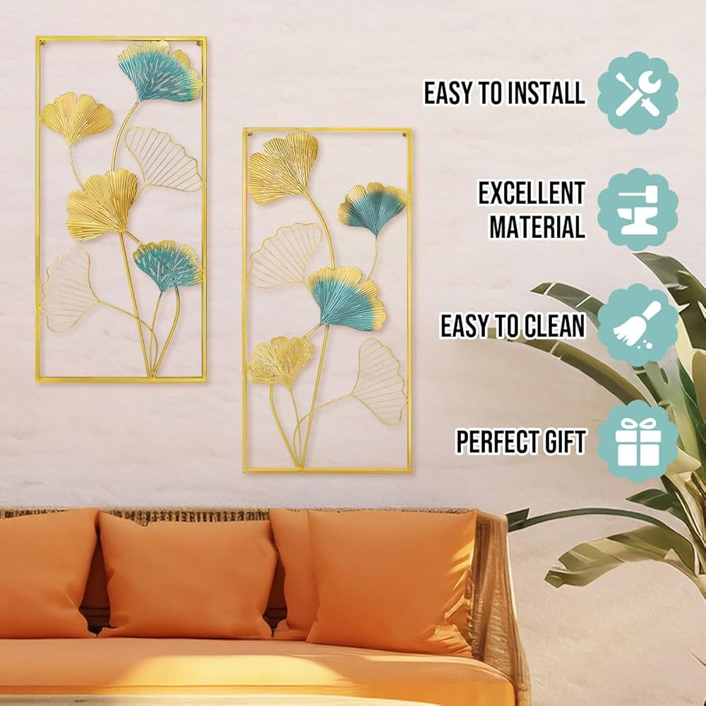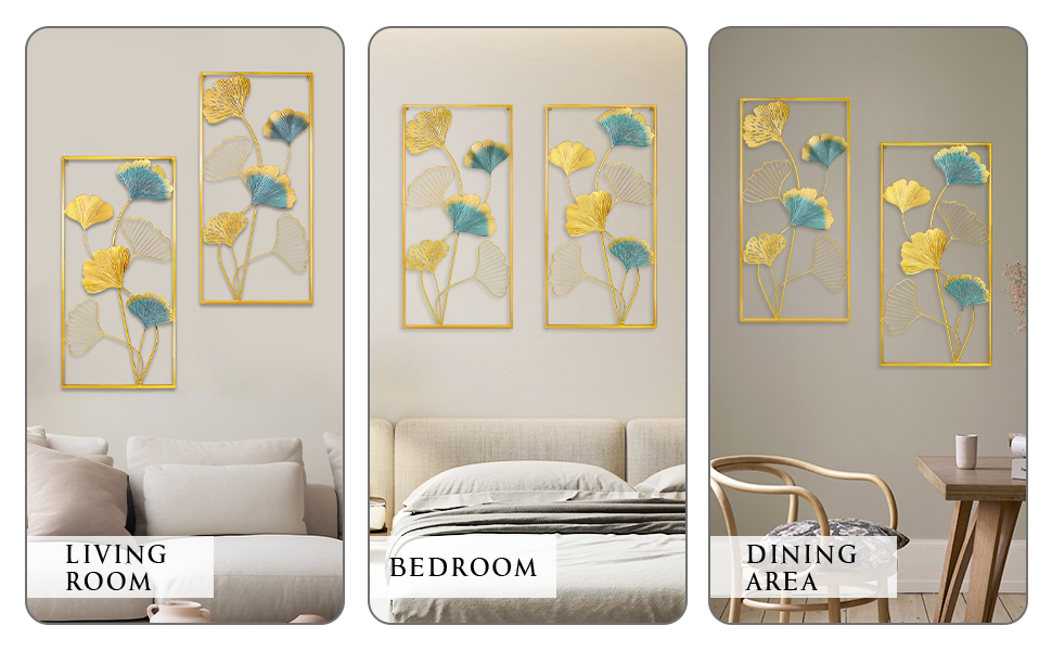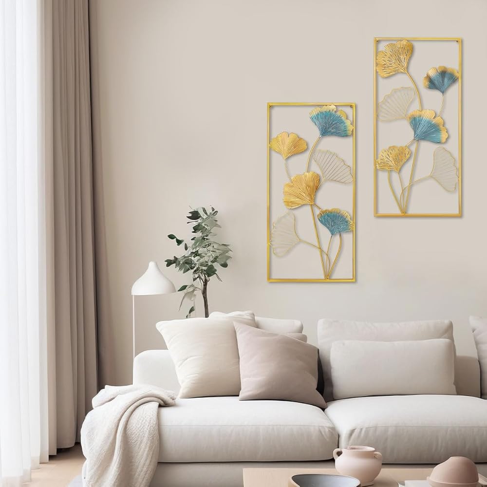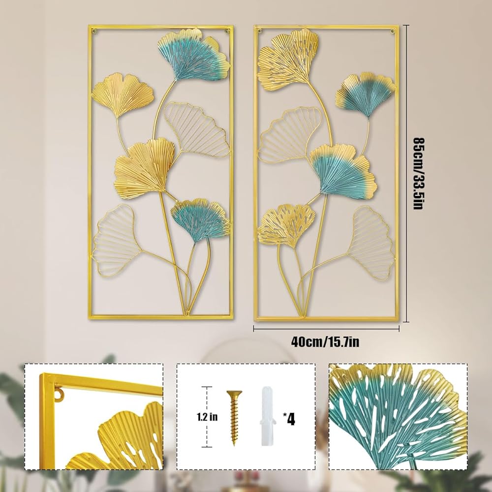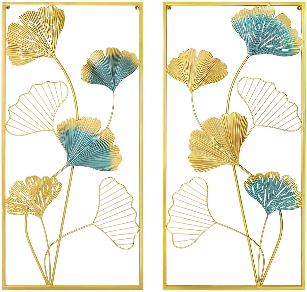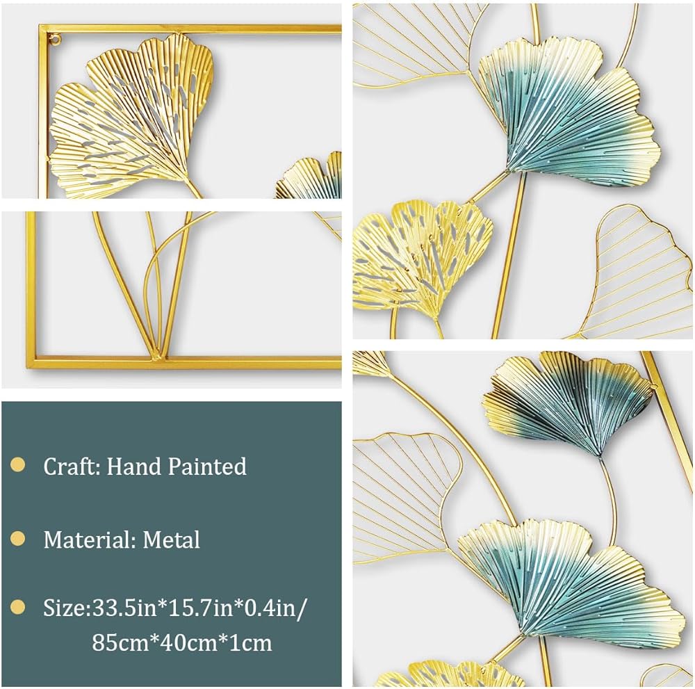 【تصميم لافت للنظر】ثلاثة أشكال مختلفة من أوراق الجنكة وإطار معدني ذهبي لامع تشكل منحوتات الحائط الفنية المعدنية. مزيج ساحر من الألوان الذهبية والأزرق الفاتح يزين هذه التحفة الفنية، مما ينضح بهالة بسيطة وفاخرة.