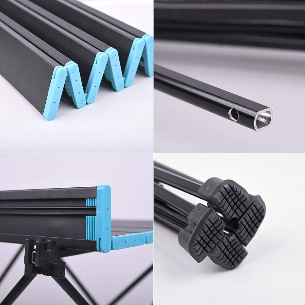 Material: Table top and bracket made of super lightweight aluminum alloy.Four legs are equipped with a non-slip base, suitable for any floor, will not skidding.High strength aluminum frame can provide strong support. Compared with nylon-table and wooden-table,aluminum table is more sturdy ,weather-resistant,and long-lasting use time
