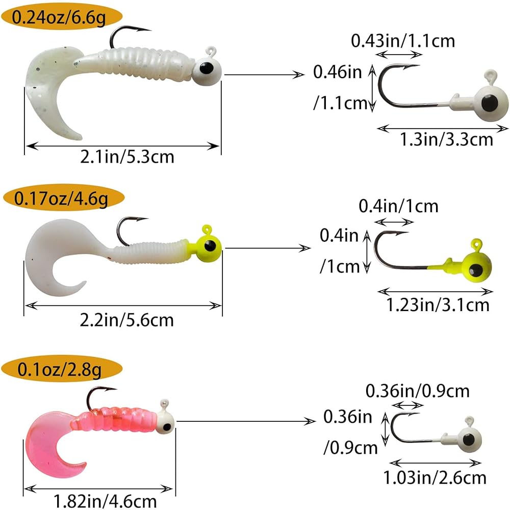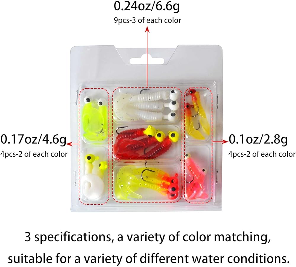 【محتويات العبوة】17 قطعة من طعوم صيد الأسماك الملونة، كل منها مزود بخطاف رأس من الرصاص، بإجمالي ثلاثة مواصفات للوزن. ملاحظة: نظرًا لاختلاف الدُفعات، ستختلف ألوان الطعم عن الصور التي عرضناها، ولكن الجودة جديرة بالثقة.