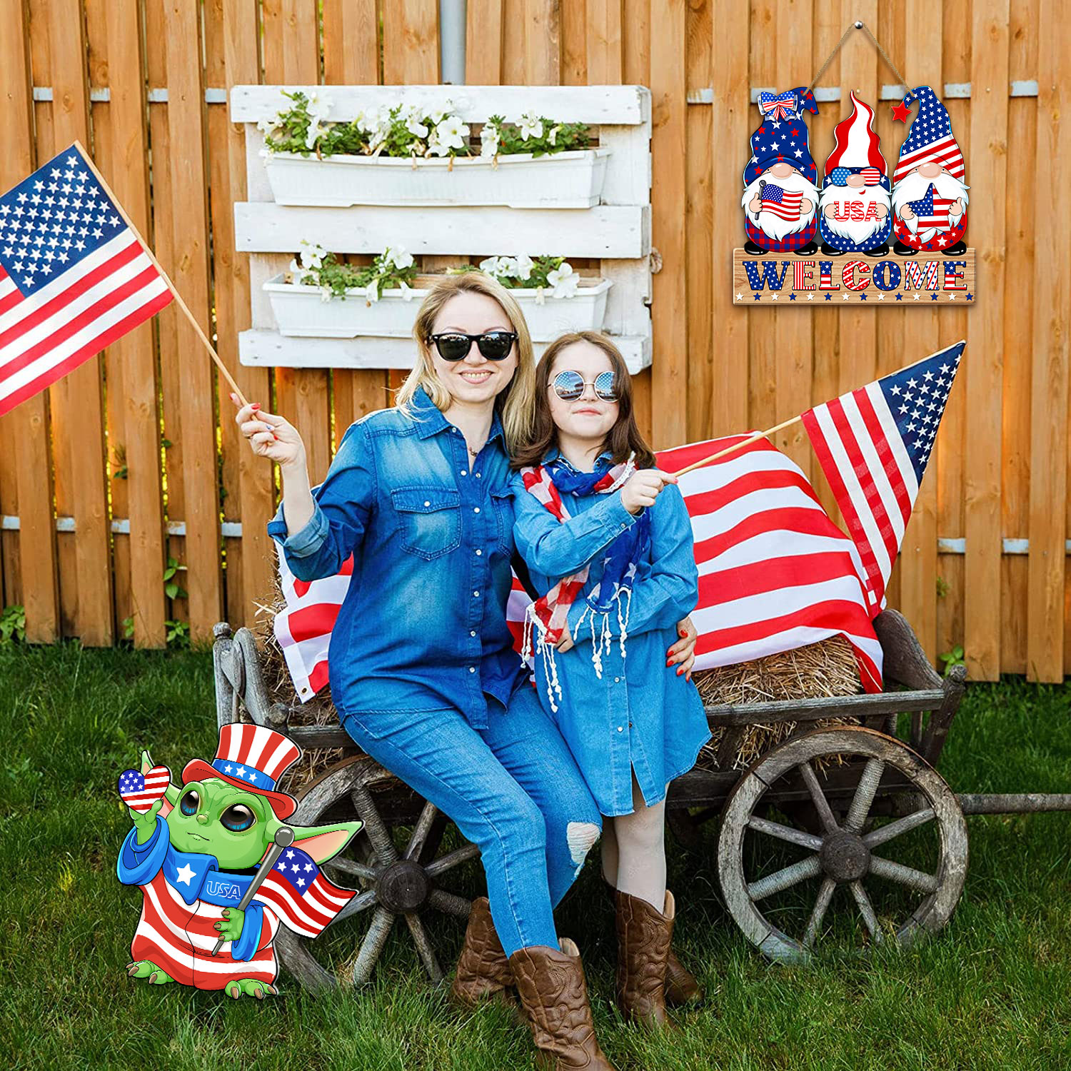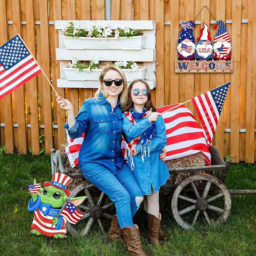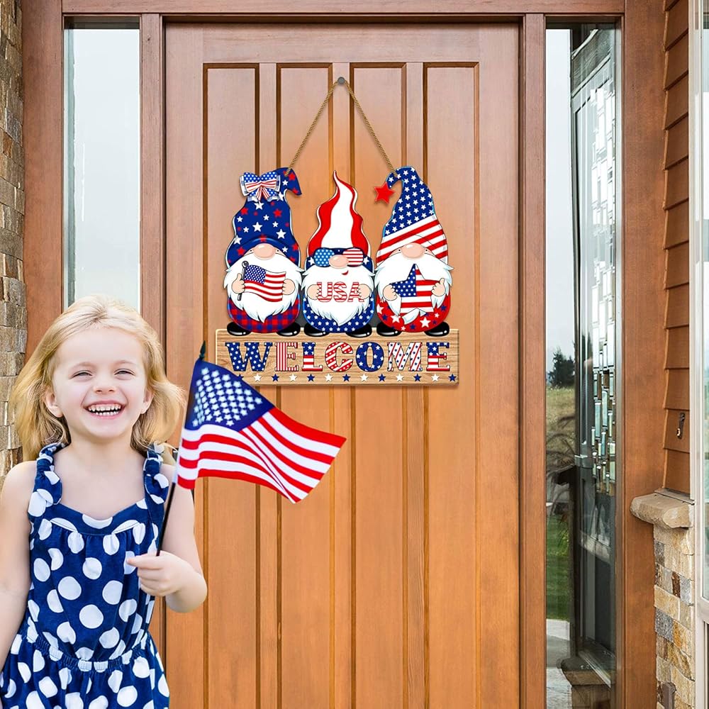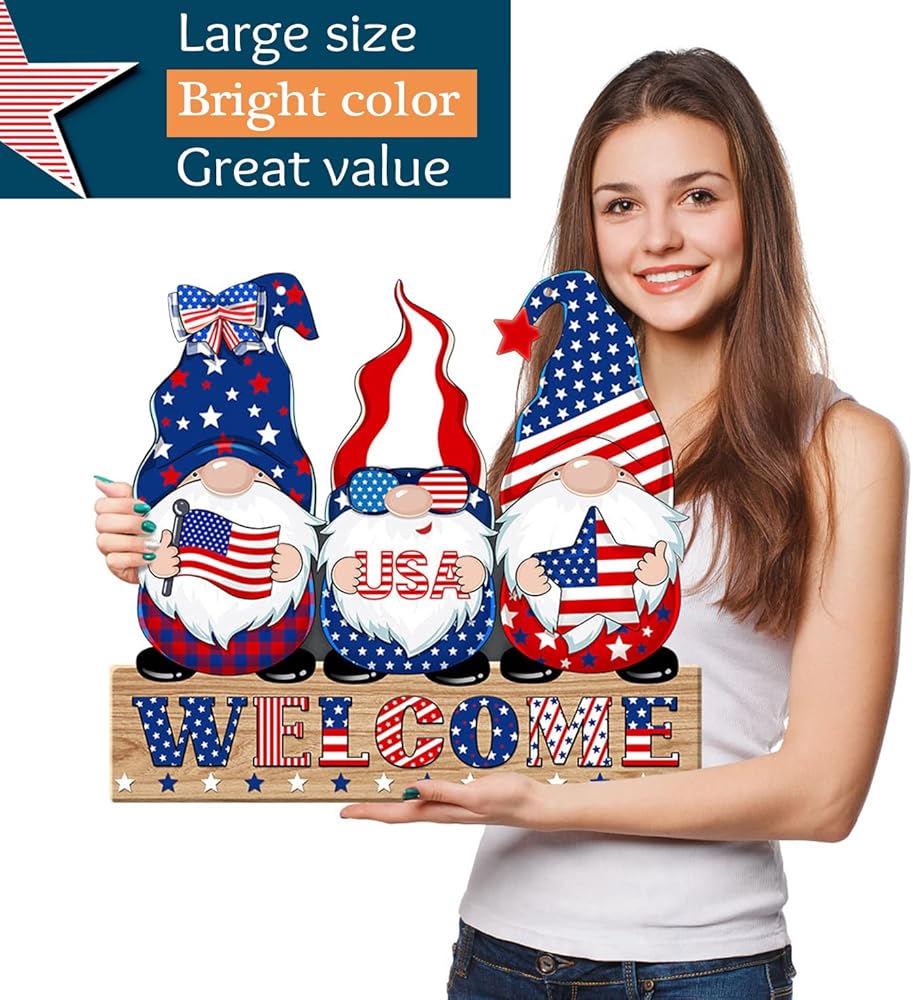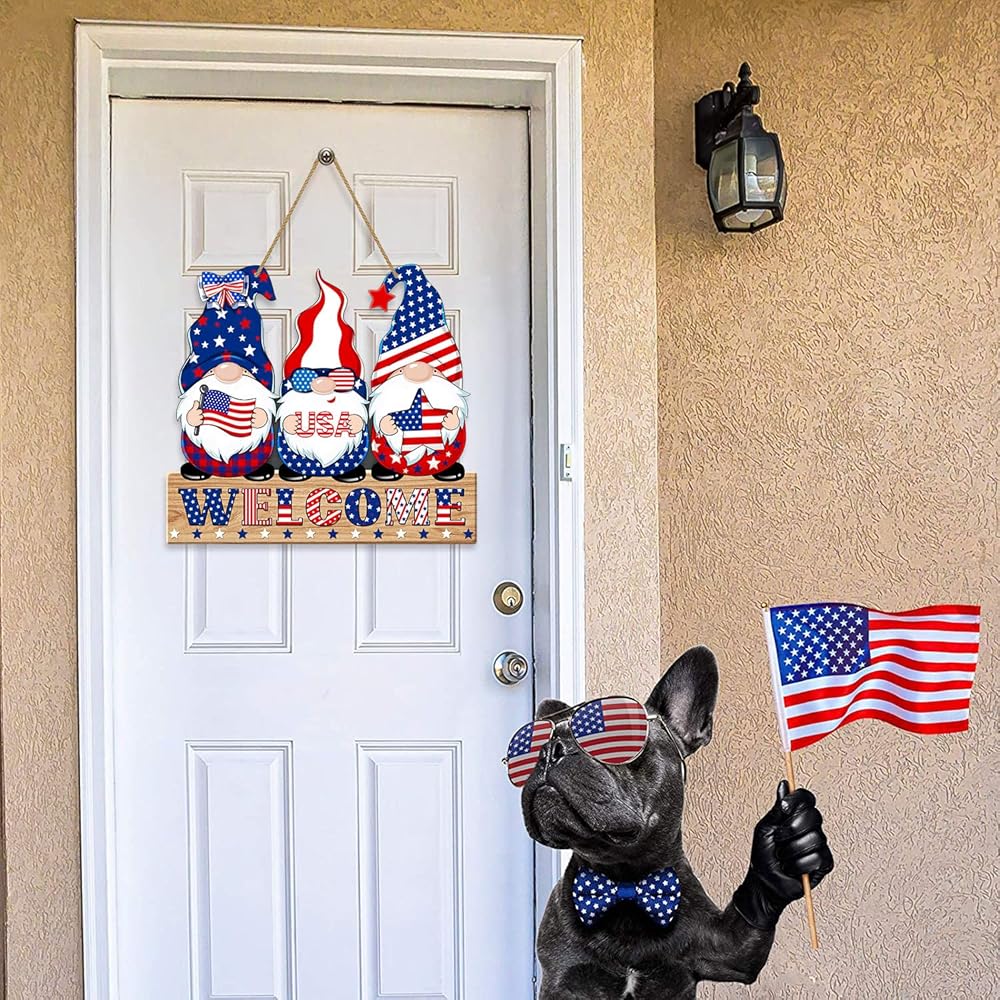 4th of July Welcome Sign Decorations Patriotic Gnomes Wooden Signs Star American Flag Large Hanging Decor for Independence Day Party Memorial Day Outdoor Home Front Door Window Wall Porch Ornament