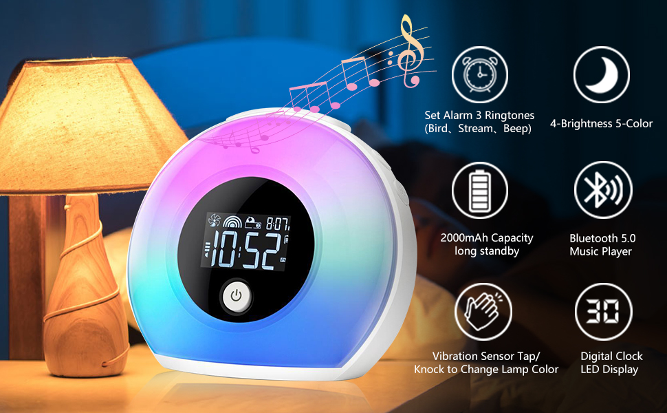 【ساعة منبه مع مكبر صوت بلوتوث】: يجمع مصباح النوم الموسيقي هذا بين ضوء الاستيقاظ وساعة المنبه والضوء الليلي الملون ومكبر صوت بلوتوث في آن واحد. أكثر سهولة في الاستخدام لاحتياجاتك المختلفة.