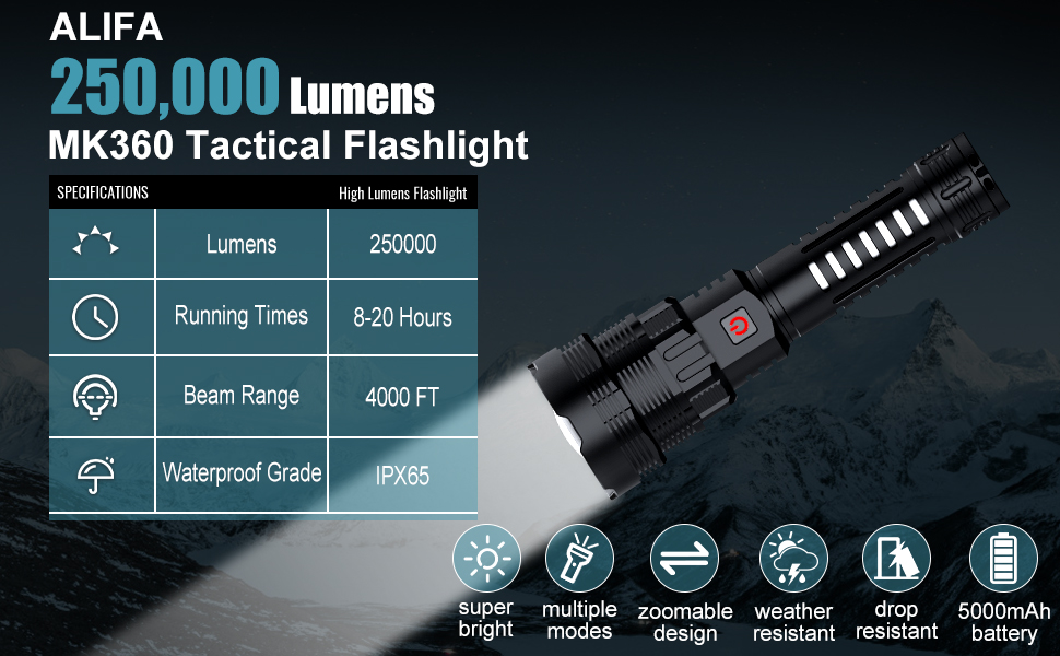 • مصباح يدوي فائق السطوع 250000 لومن - استمتع بسطوع لا مثيل له وإضاءة أحلك الزوايا، بفضل شريحة LED المدمجة ذات 36 لومن عالية (U1). هذه الرقائق المتطورة