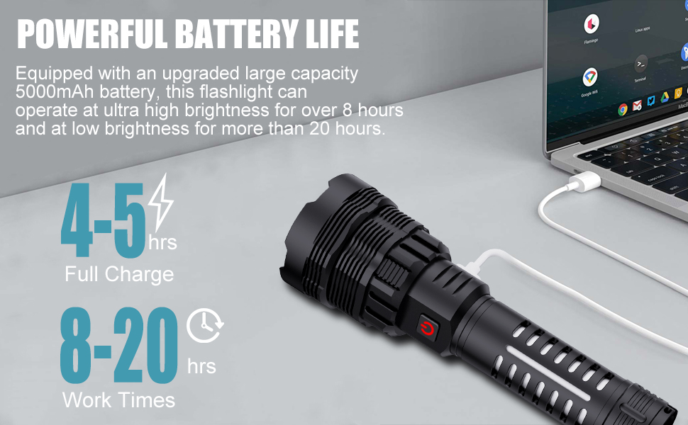 • مصباح يدوي فائق السطوع 250000 لومن - استمتع بسطوع لا مثيل له وإضاءة أحلك الزوايا، بفضل شريحة LED المدمجة ذات 36 لومن عالية (U1). تنتج هذه الرقائق المتطورة مخرجات عالية جدًا تبلغ 250,000 لومن، متجاوزة مصابيح LED العادية على قدم وساق! استعد للدهشة لأنه يسلط ضوءًا ساطعًا على الأشياء حتى مسافة مذهلة تصل إلى 4000 قدم.