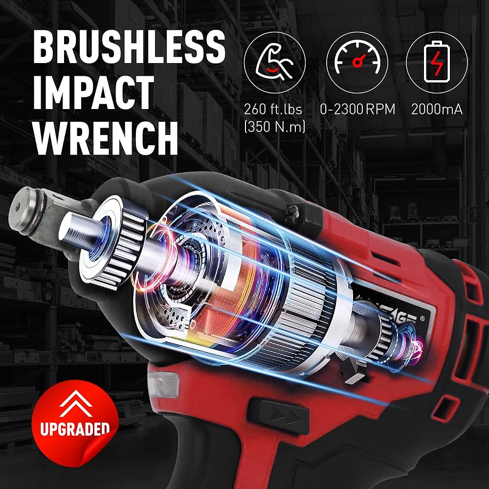 مانوساج مفتاح عدة لاسلكي 20 فولت 1/2 انش، محرك قوي بدون فرشاة، أقصى عزم دوران 260 قدم باوند، 2 امبير في الساعة مع مجموعة مقبس عزم مفك 4 قطع، قطعة واحدة من لقم براغي اس دي اس وحقيبة ادوات (QSPT566012A)