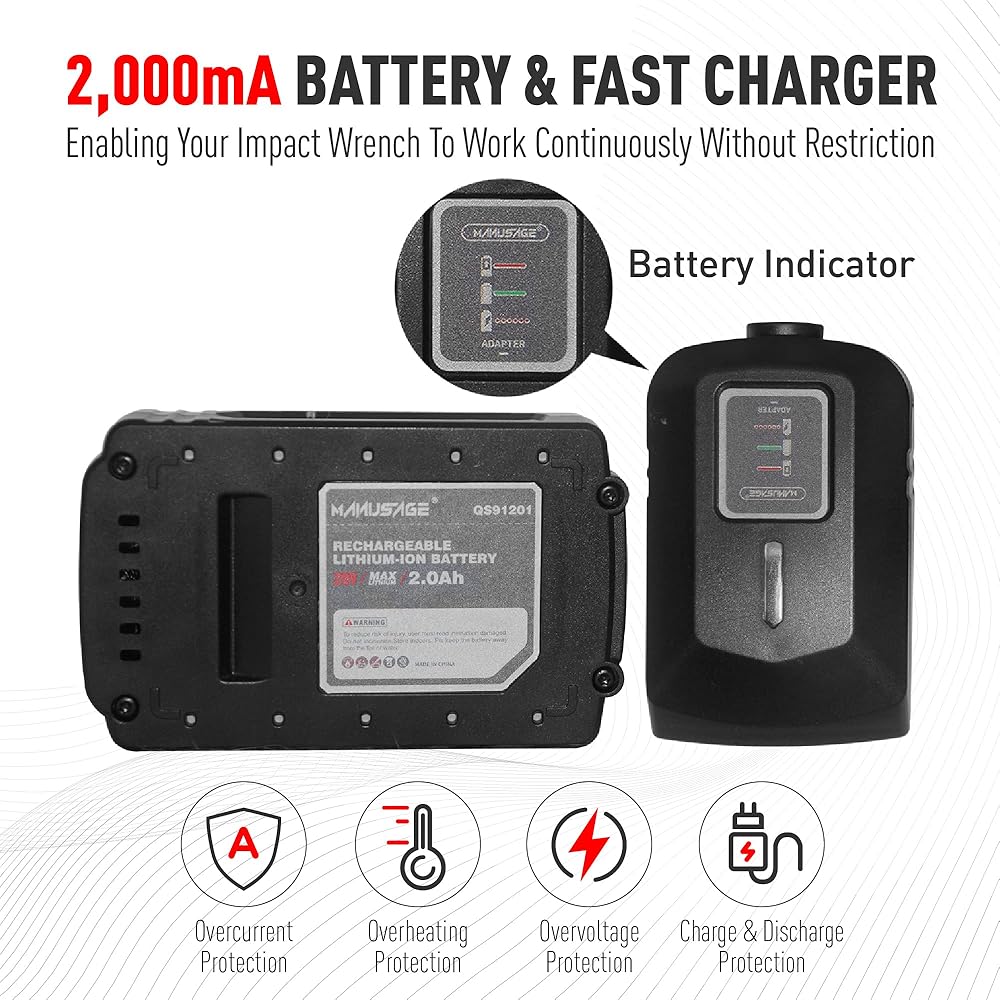 • 【بطارية 2.0 امبير في الساعة】يأتي مفتاح الربط اللاسلكي مانوسيج مع بطارية 2000 مللي امبير في الساعة، وهي ضعف قوة مفاتيح العدة العادية، بحيث يمكنك استخدامه دون القلق بشأن فقدان الطاقة في منتصف عملك. يمكن شحنها بالكامل في ساعات لتسريع كفاءة العمل.